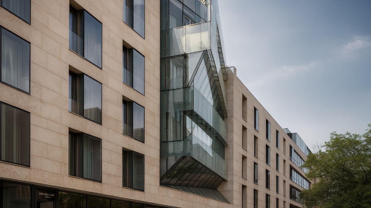 Визитная карточка Crystal House – фасады, выполненные в технике стеклянных витражей, дополненные натуральным камнем.