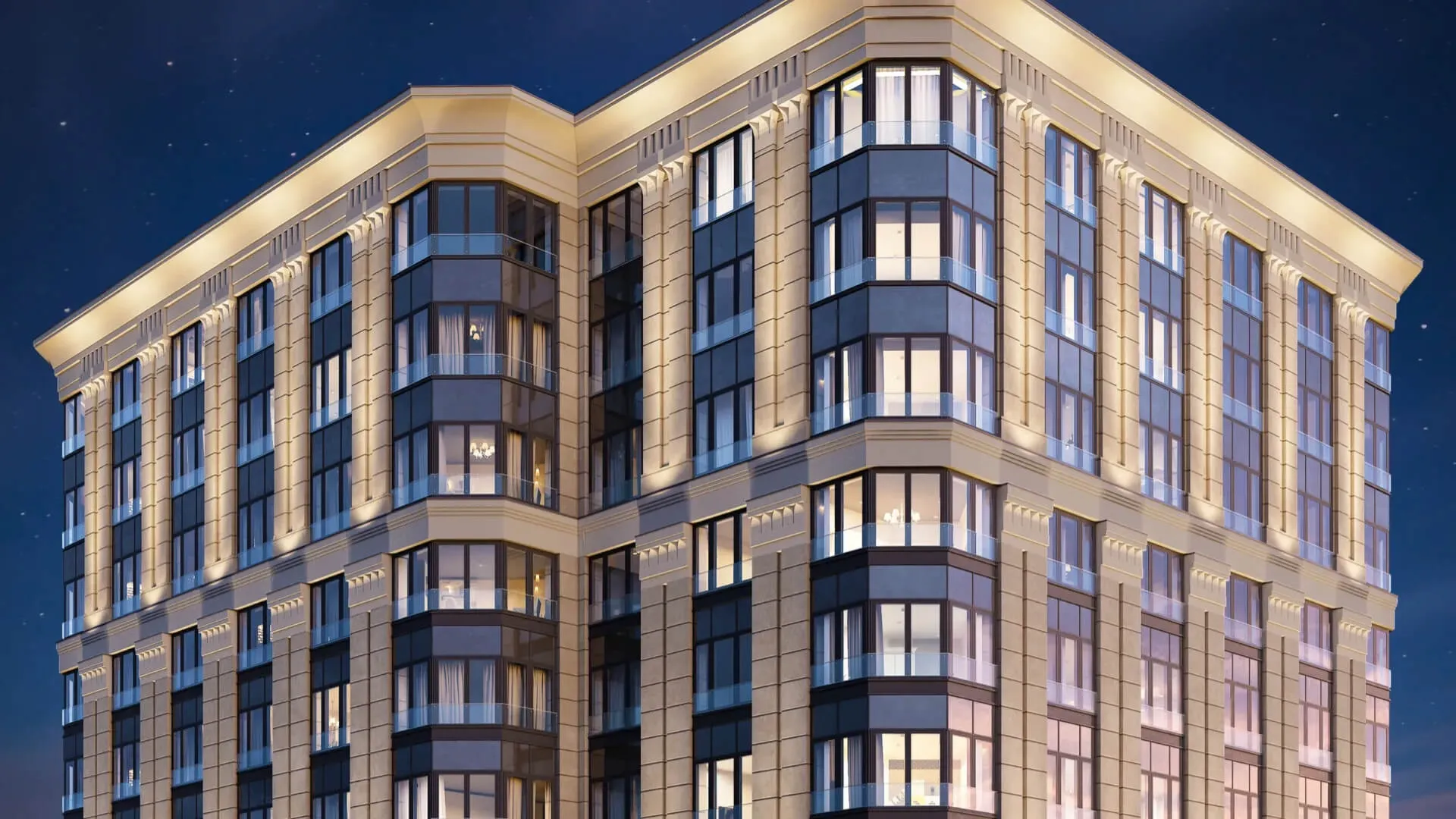 Фасад здания выглядит невесомым благодаря панорамным оконным системам. На верхних этажах вас ждут роскошные апартаменты, а некоторые планировки включают собственные террасы для отдыха под открытым небом.
