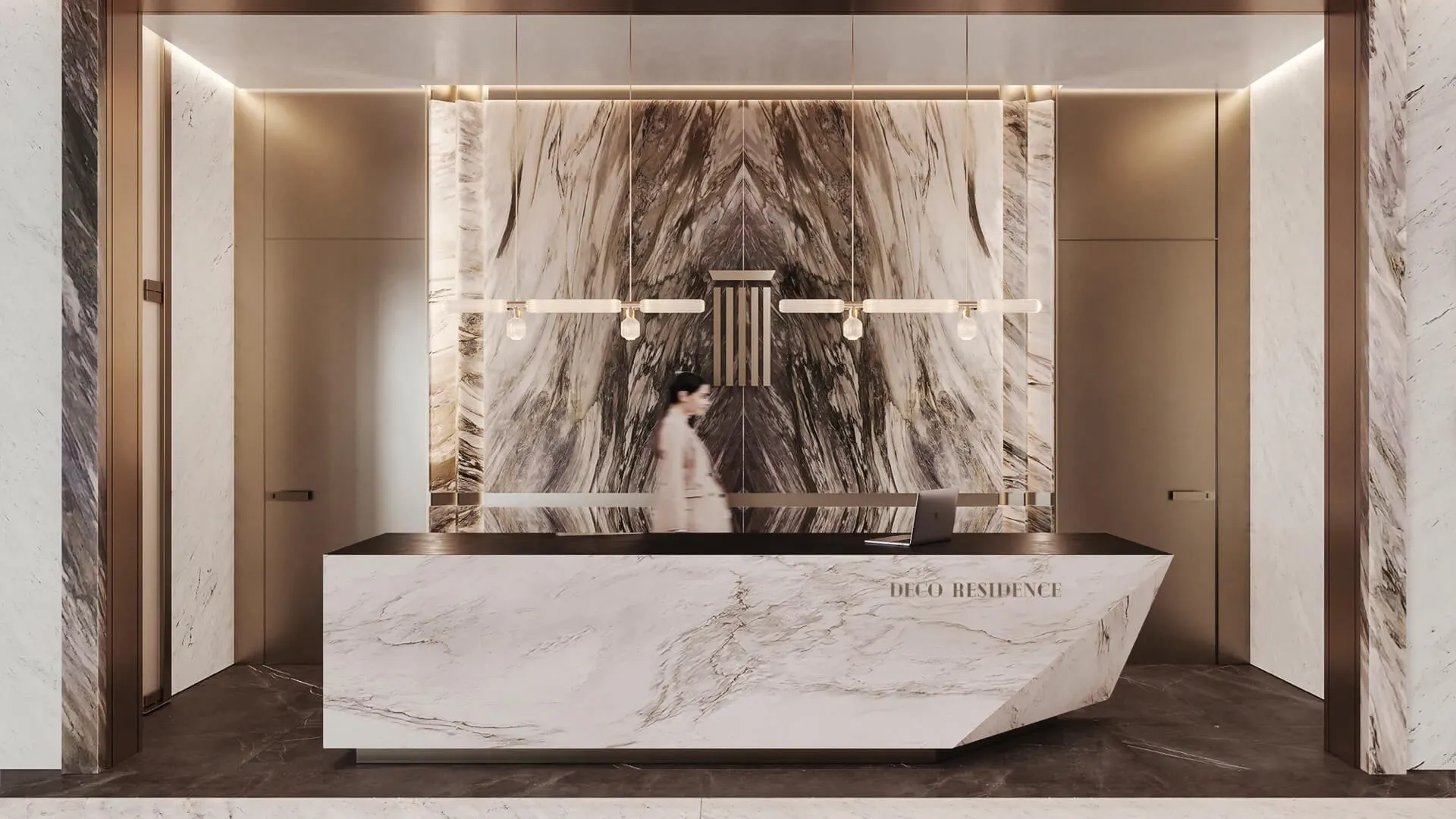 Входная группа DECO Residence встречает жителей и гостей впечатляющим лобби.