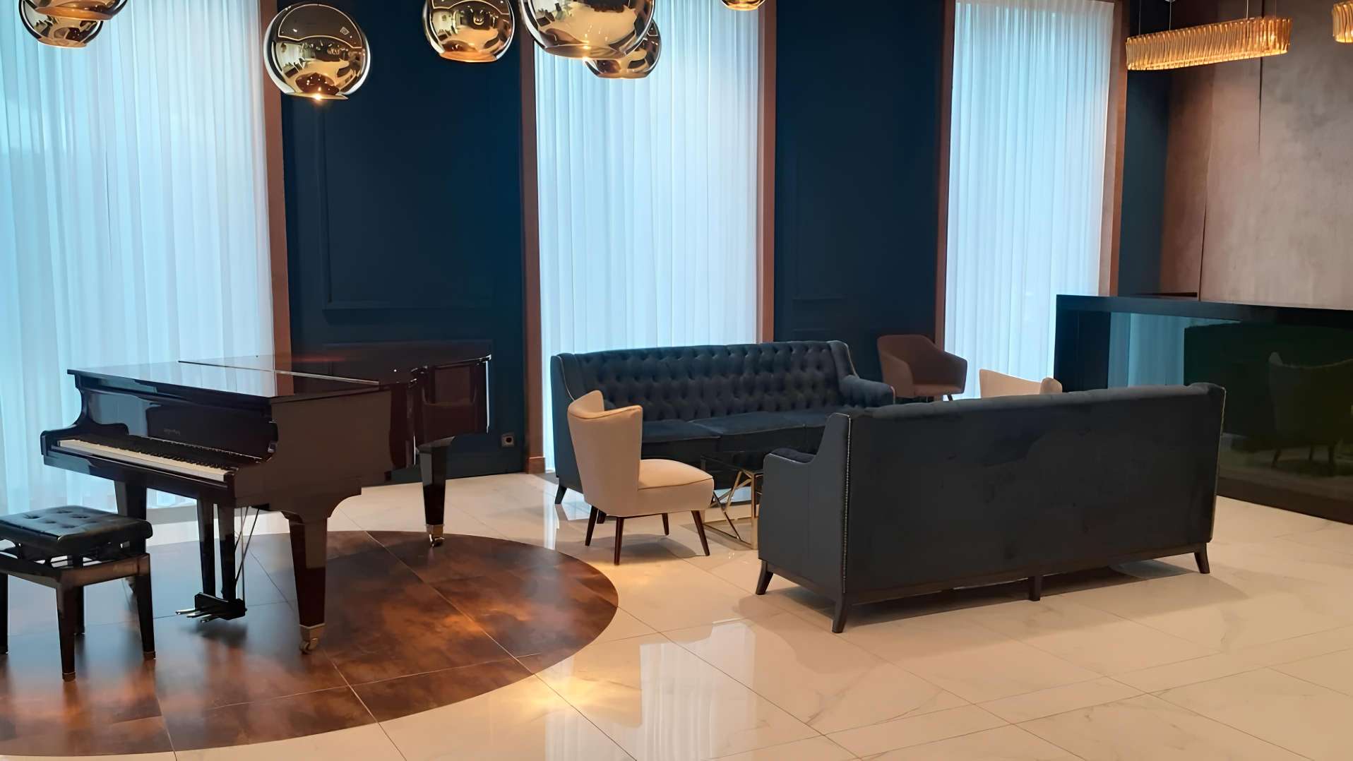 Интерьеры выполнены в спокойных, нейтральных тонах с использованием дорогих материалов: мрамора, натурального дерева и авторской мебели. Для неформального общения и деловых встреч предусмотрены комфортабельные лаунж-зоны.