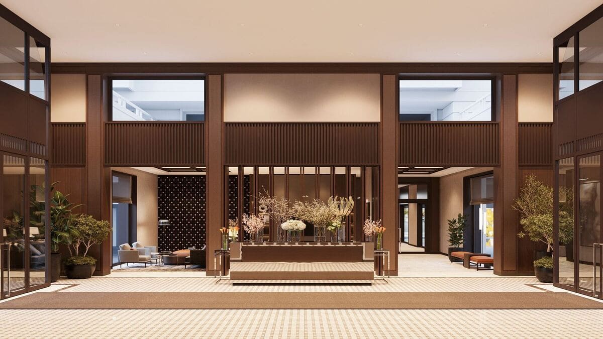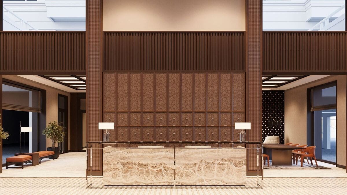 Лобби продолжает архитектурный стиль здания – с акцентом на высоту, симметрию и детализацию.