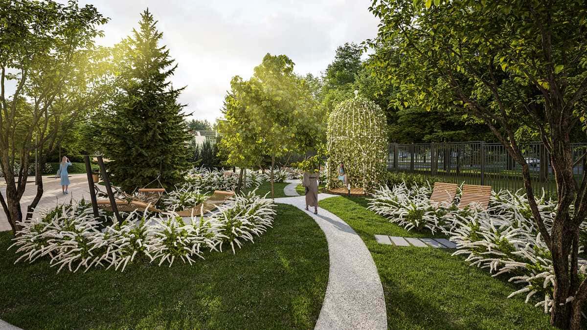 Здесь гармонично сочетаются детская площадка по стандарту Kid’s Lab, амфитеатр для мероприятий и спортивная зона с тренажерами и универсальной площадкой для игр.
