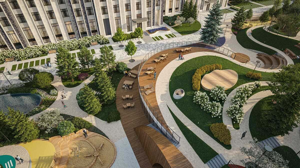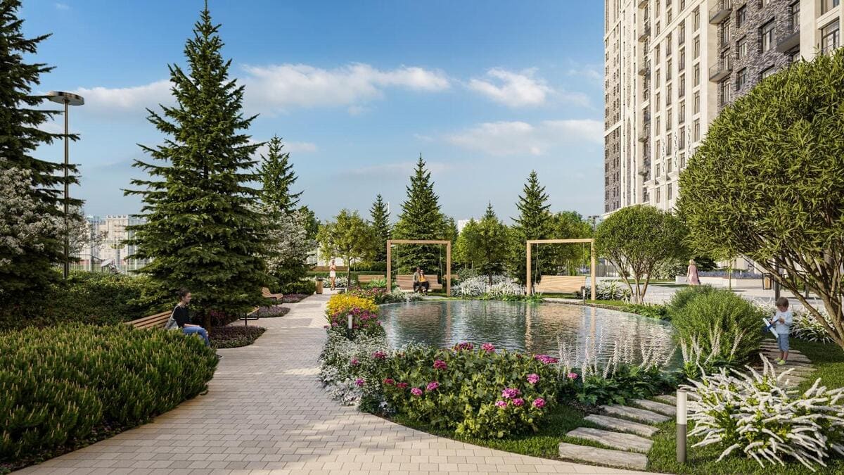 Жители могут гулять вдоль пруда, отдыхать в lounge-зонах или провести время на благоустроенном бульваре у торговой галереи и ресторанов.