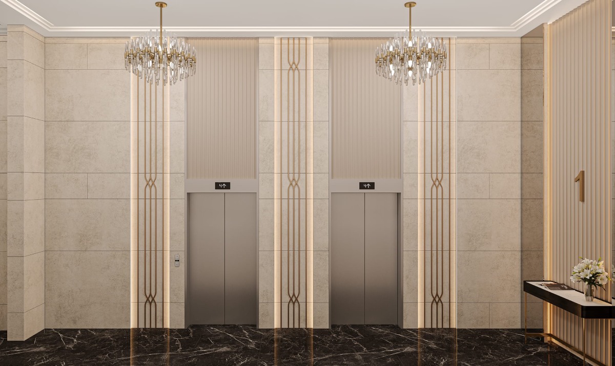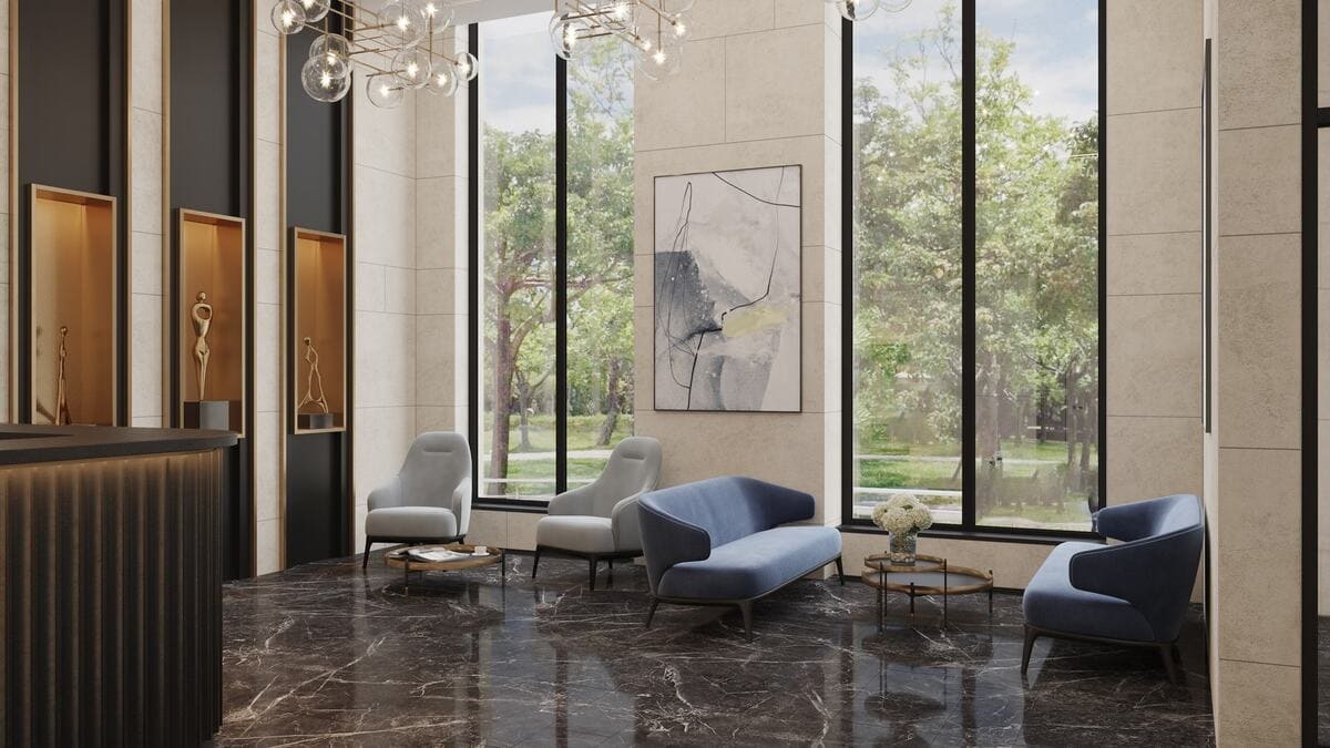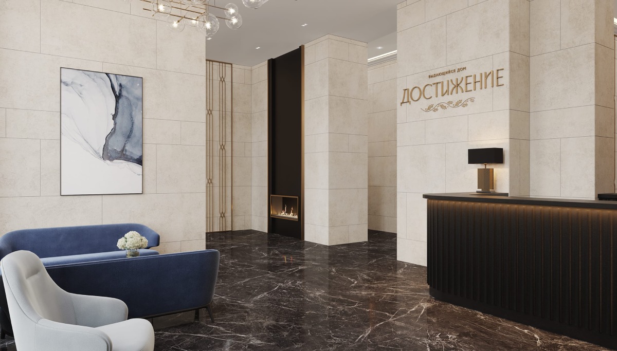 В лобби расположены lounge-зона с камином, стойка ресепшена, зона ожидания с диванами и креслами, санузел и колясочная с автоматической дверью.