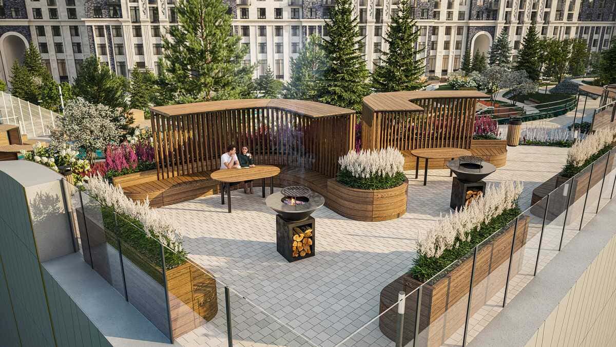 Комплекс предлагает 115 уникальных вариантов планировок: от компактных студий площадью от 23 м² до просторных квартир с дровяными каминами и эксклюзивных пентхаусов с террасами.