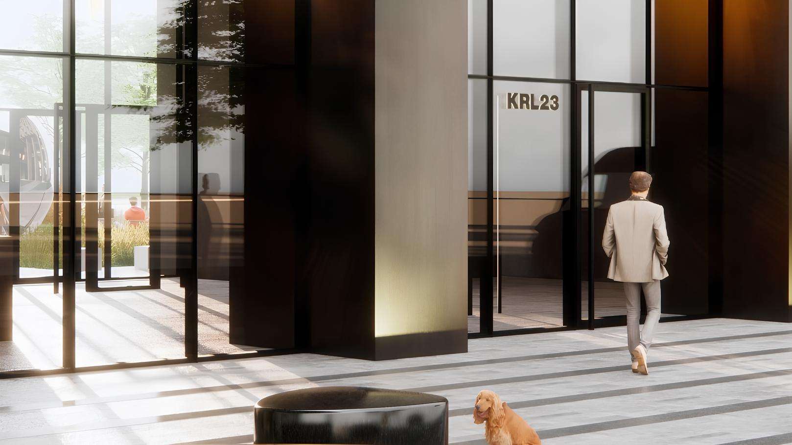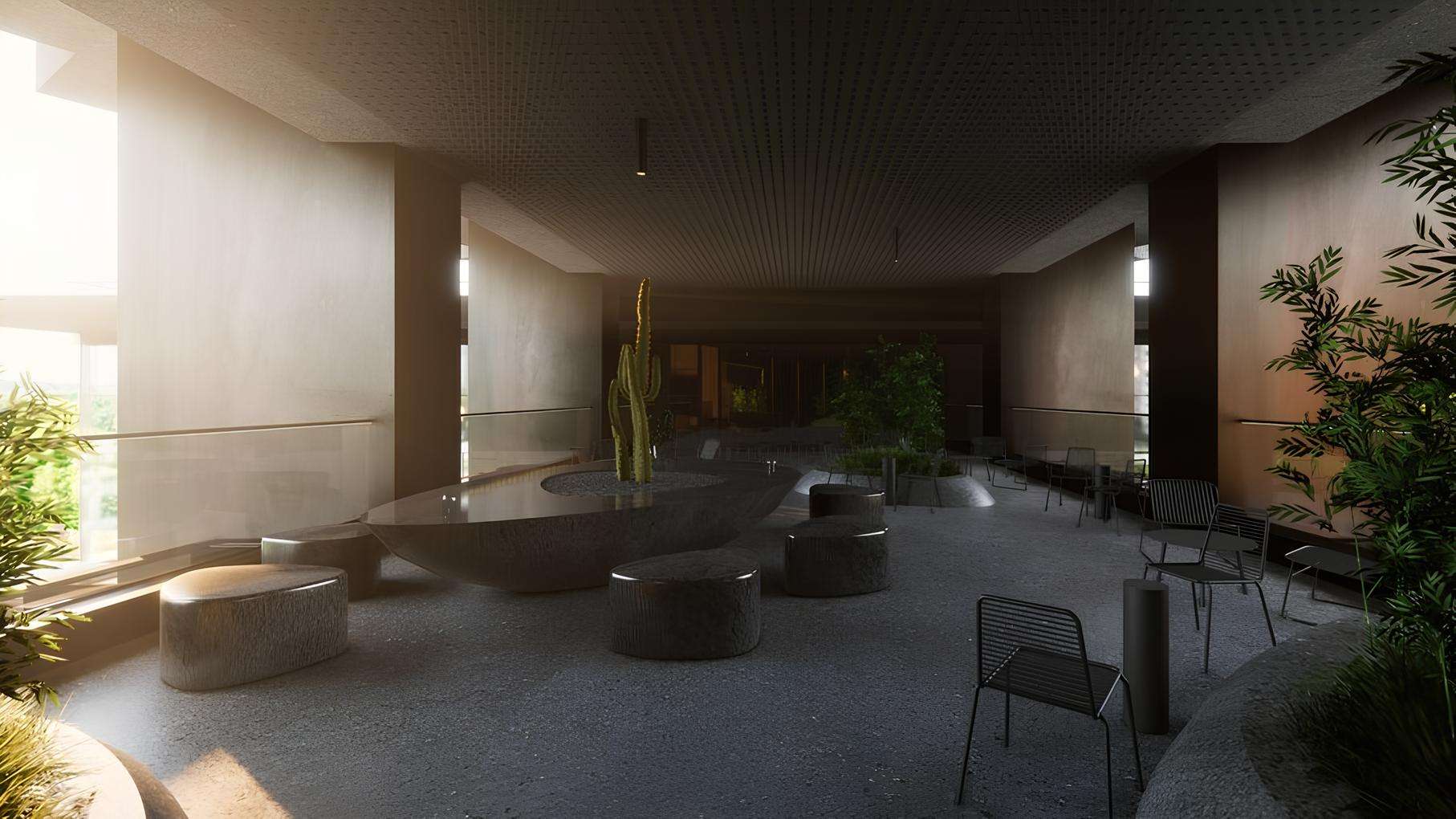 Центральным элементом является уникальная авторская люстра, созданная специально для этого проекта, чей свет в сочетании с теплой подсветкой создает атмосферу уюта и гостеприимства. Над лобби обустроена уютная терраса для отдыха резидентов, откуда также открываются прекрасные виды. Просторная зона ресепшена и продуманная навигация подчеркивают статусность и приватность клубного формата жизни.