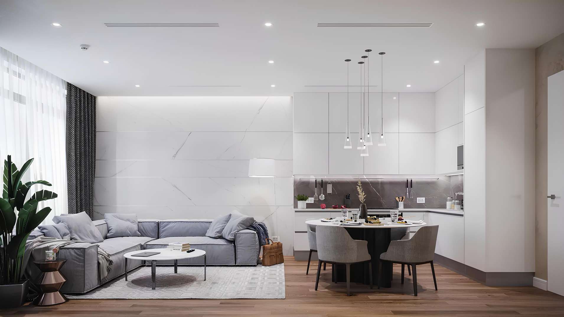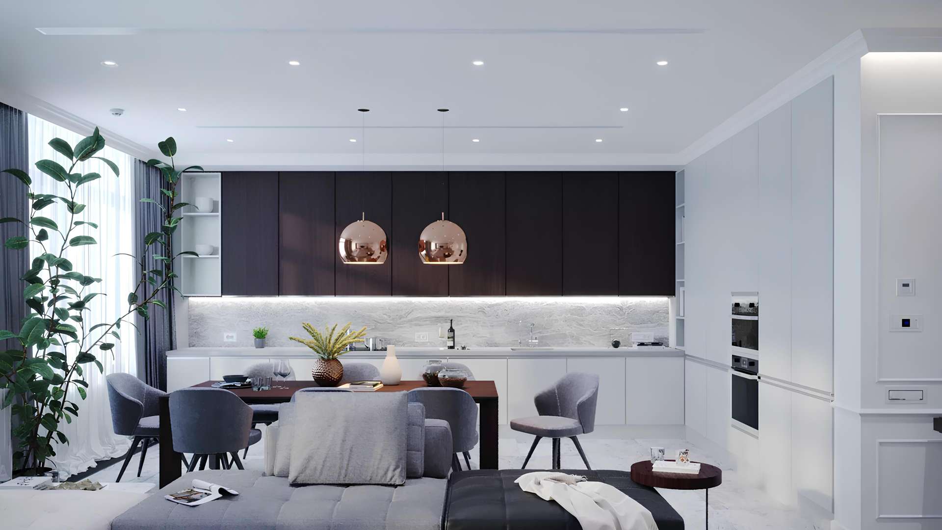 Строгая геометрия, использованного в оформлении стен, колонн и порталов, отсылает к эстетике конструктивизма, придавая интерьерам динамику и стиль. Благодаря крупноформатному панорамному остеклению квартиры наполнены естественным светом в течение всего дня.