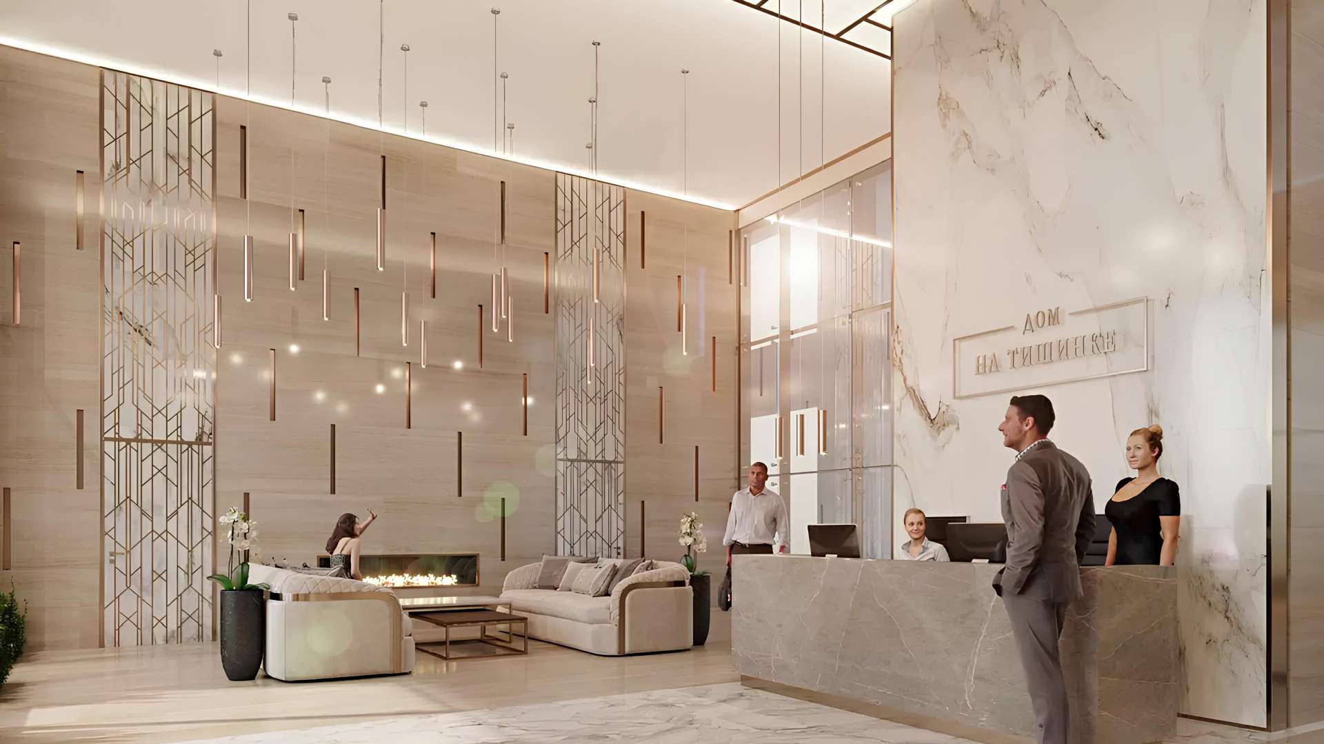 Парадные лобби «Дома на Тишинке» задают тон всей жизни в комплексе. Мебель выдержана в спокойных, нейтральных тонах: благородные серые, кремовые и бежевые оттенки.