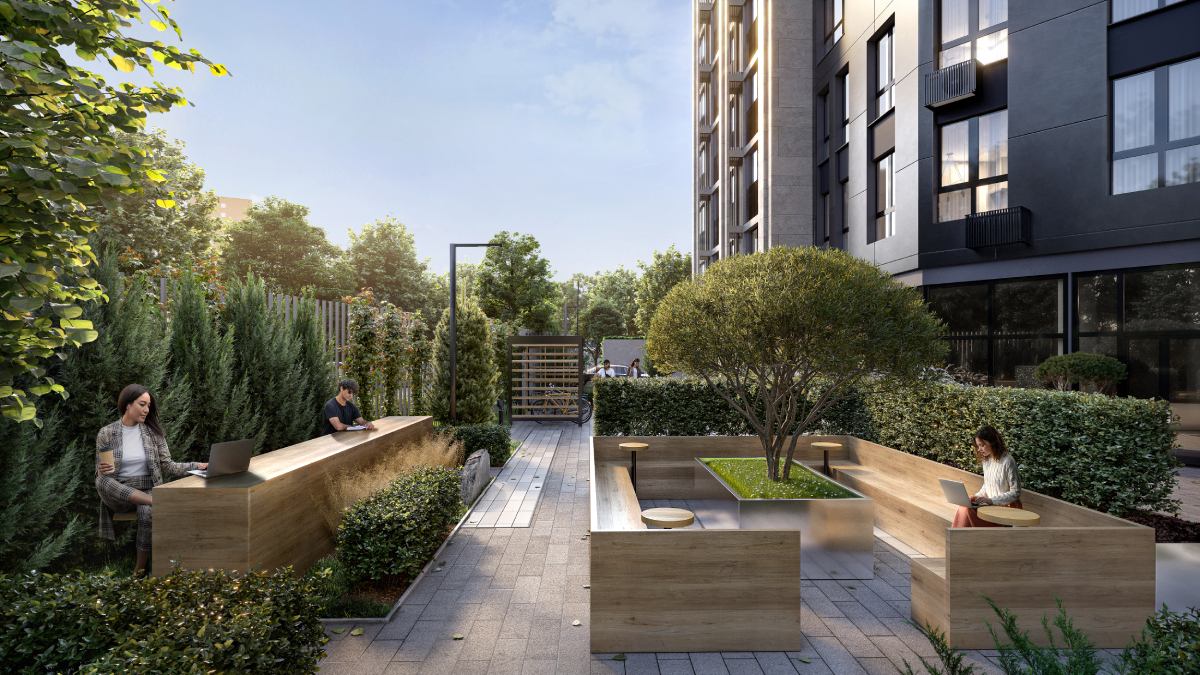 Территория комплекса включает два благоустроенных двора – общественный и приватный, доступный только резидентам. Каждая зона оформлена с акцентом на эстетику и приватность.