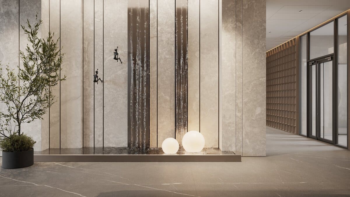 В интерьере гармонично сочетаются природные мотивы – берёзовые текстуры, водная гладь вертикального фонтана – и футуристические элементы зонирования.