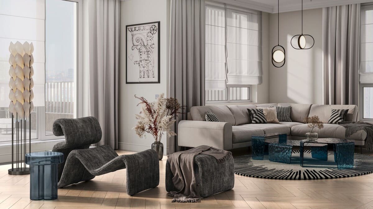 Фасады выполнены в монохромных тонах и украшены асимметричной сеткой окон, которая делает облик дома визуально живым. Облицовка – из долговечных вентилируемых панелей, имитирующих текстуру бетона и натурального камня.