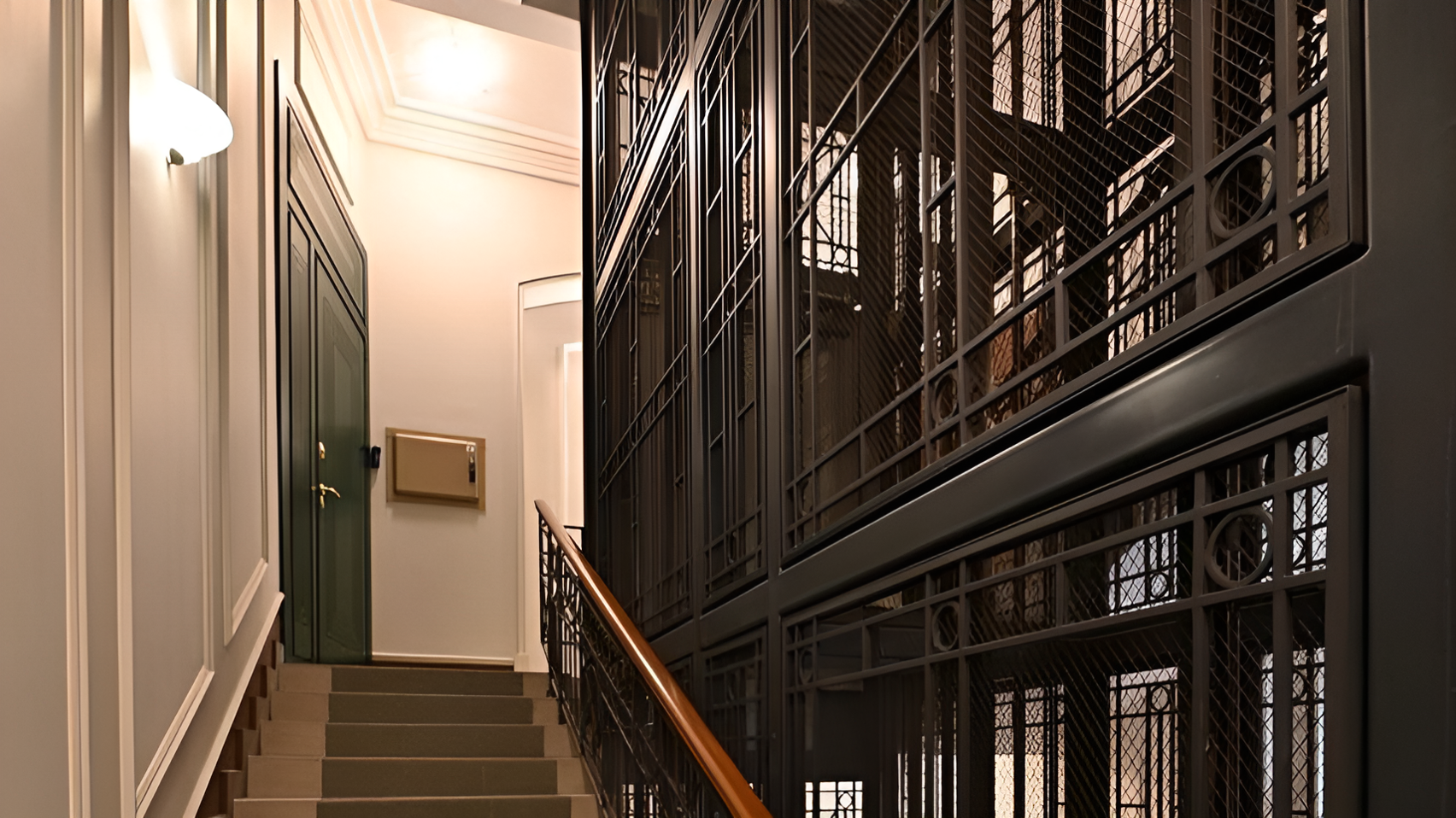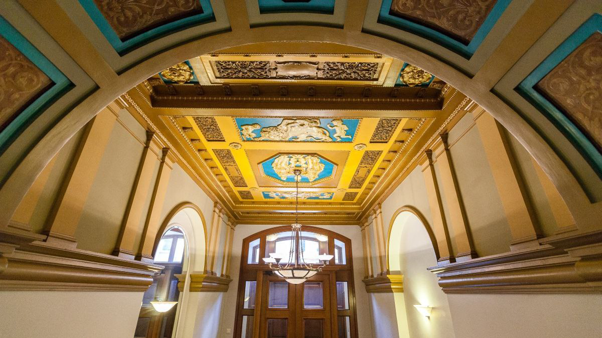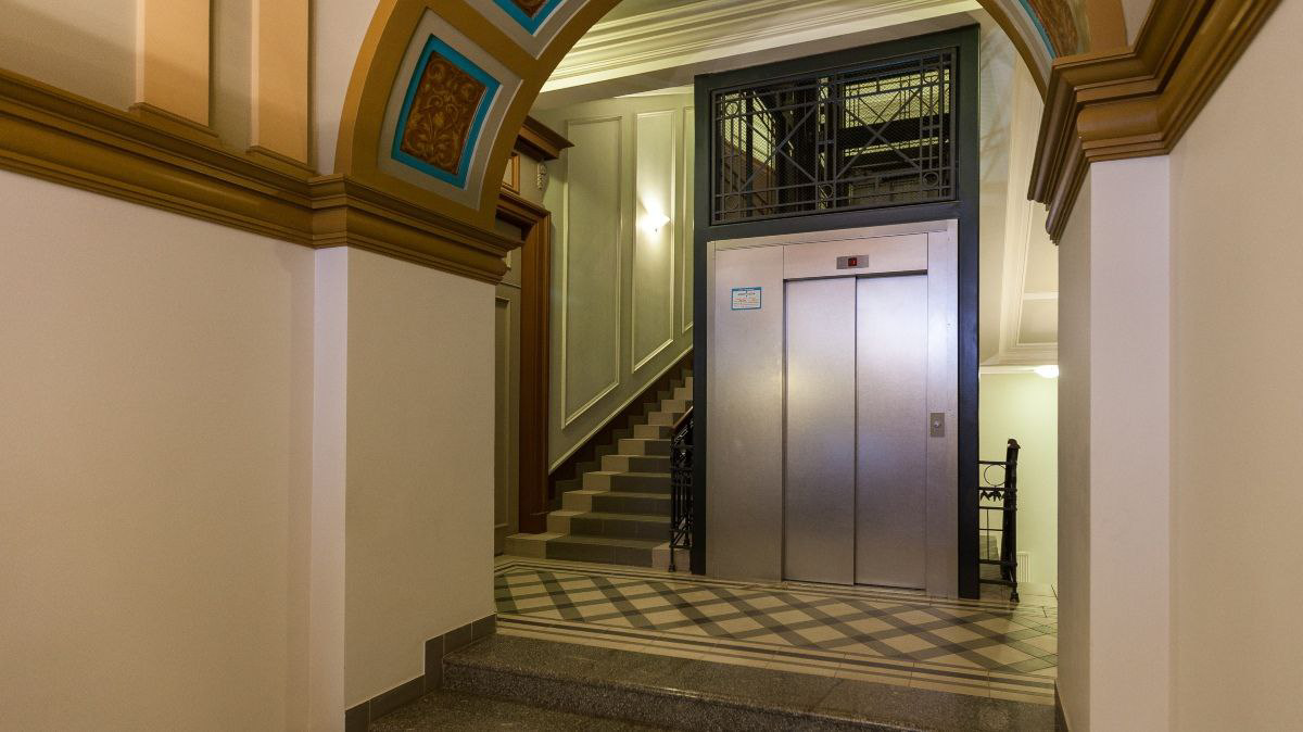 Переступая порог «Дома со Львами», вы попадаете в пространство, напоминающее лобби премиального отеля. Парадная лестница, отделанная мрамором, и холлы с золотой лепниной на потолках бережно сохраняют атмосферу прошлого столетия. Входную группу украшают колонны с ажурными капителями, ведущие в лифтовый холл.