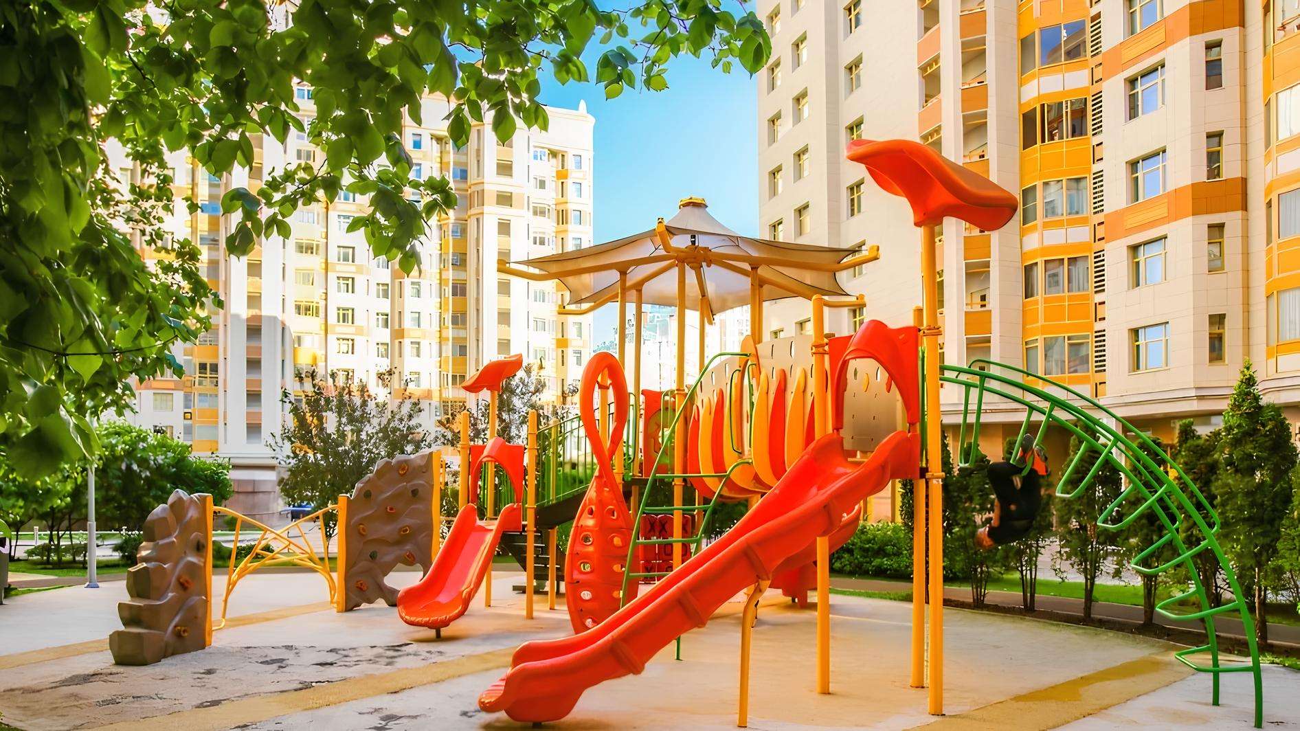 Ландшафтный дизайн с аккуратными газонами, деревьями и цветниками создает ощущение парка. Для детей оборудованы современные игровые площадки с безопасным резиновым покрытием, а для любителей спорта — зоны воркаута, столы для настольного тенниса и площадки для игр с мячом. Прогулочные аллеи со скамейками, велодорожки и даже специальные площадки для выгула собак делают двор по-настоящему живым и удобным пространством.