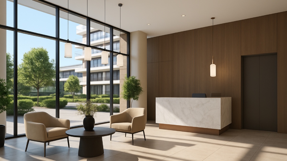 В лобби расположена стильная зона отдыха с мягкой мебелью и функциональная стойка ресепшена, что подчеркивает статусность и обеспечивает удобство жителей и гостей дома.