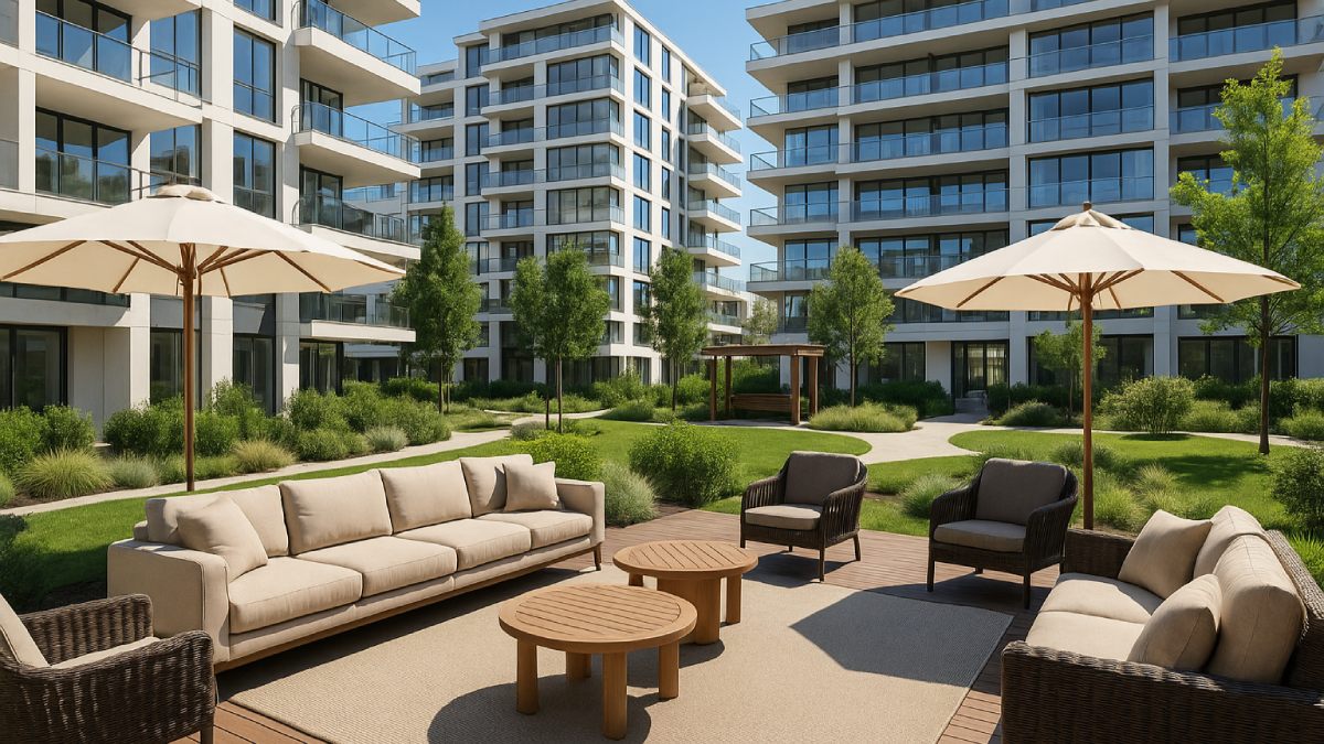 Закрытая территория комплекса оформлена в формате двор-парка, где резиденты могут наслаждаться прогулками среди зелени и отдыхать в тишине приватных lounge-зон.