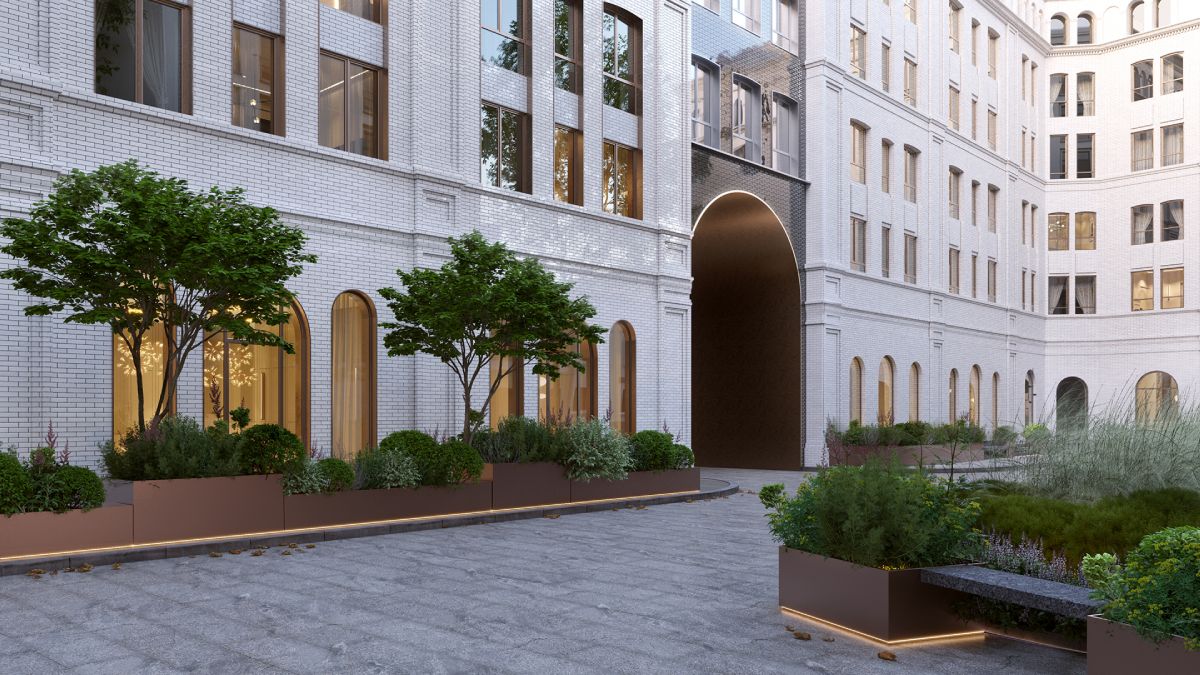 Во внутреннем дворе организовано приватное пространство для отдыха резидентов.