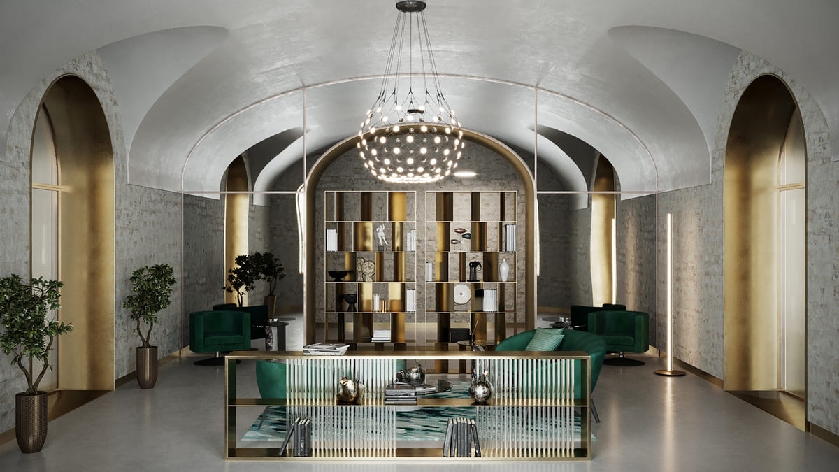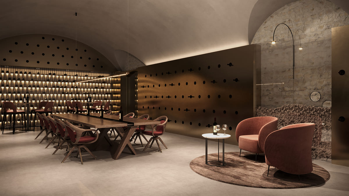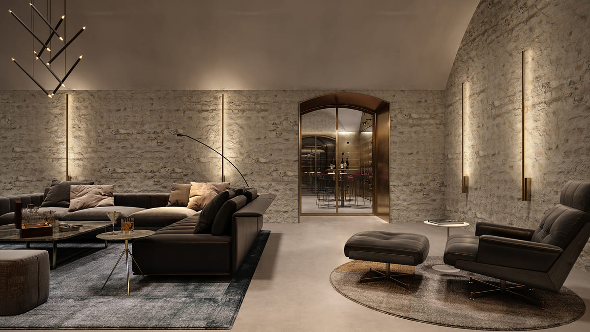 Интерьер лобби в исторической части DUO отражает уважение к подлинной архитектуре: оригинальная каменная кладка, сохранившиеся кирпичные своды и аутентичные элементы XIX века стали основой пространства.