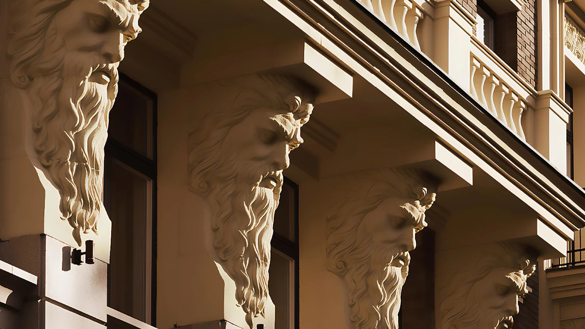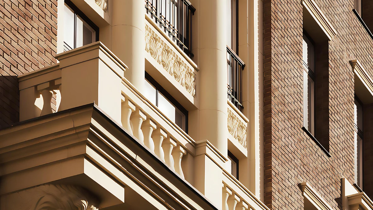 Образ дома выдержан в классическом «дворянском» стиле: фасады облицованы натуральными материалами и клинкерным кирпичом тёплого соломенного оттенка с матовым красно-рыжим отливом, декорированы колоннами, лепниной, французскими балконами и античными карнизами. Акцент – выразительные головы атлантов.