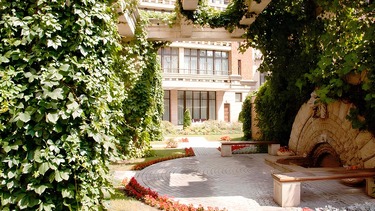 Закрытая внутренняя территория комплекса оформлена ландшафтным дизайном: колонны и перголы, оплетённые диким виноградом, создают атмосферу уединения и защищают двор от посторонних взглядов. Фонтан с лепниной и головой льва добавляет нотку античности. Во дворе проходят камерные концерты и вечера живой музыки.