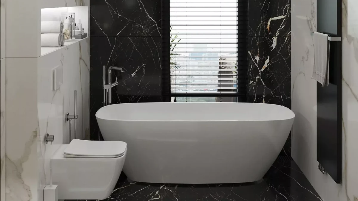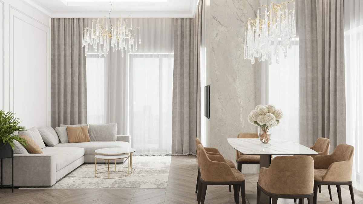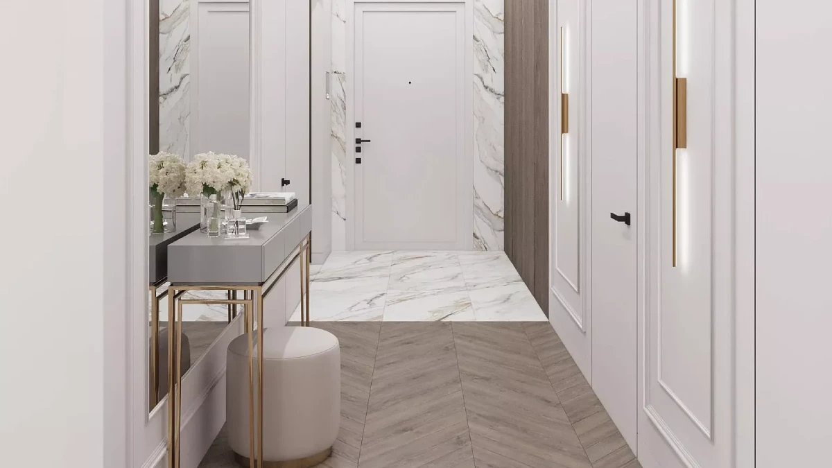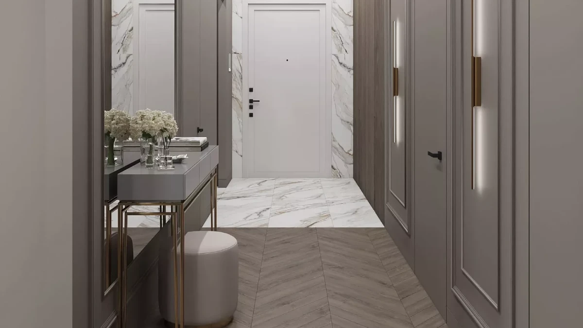 Натуральный чёрный мрамор и премиальный керамогранит подчёркивают высокий статус жильцов, а дизайнерская люстра наполняет интерьер мягким золотистым светом, создавая ощущение уюта.