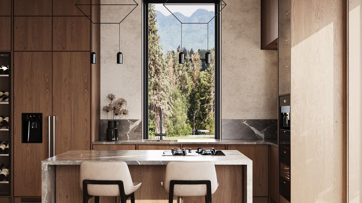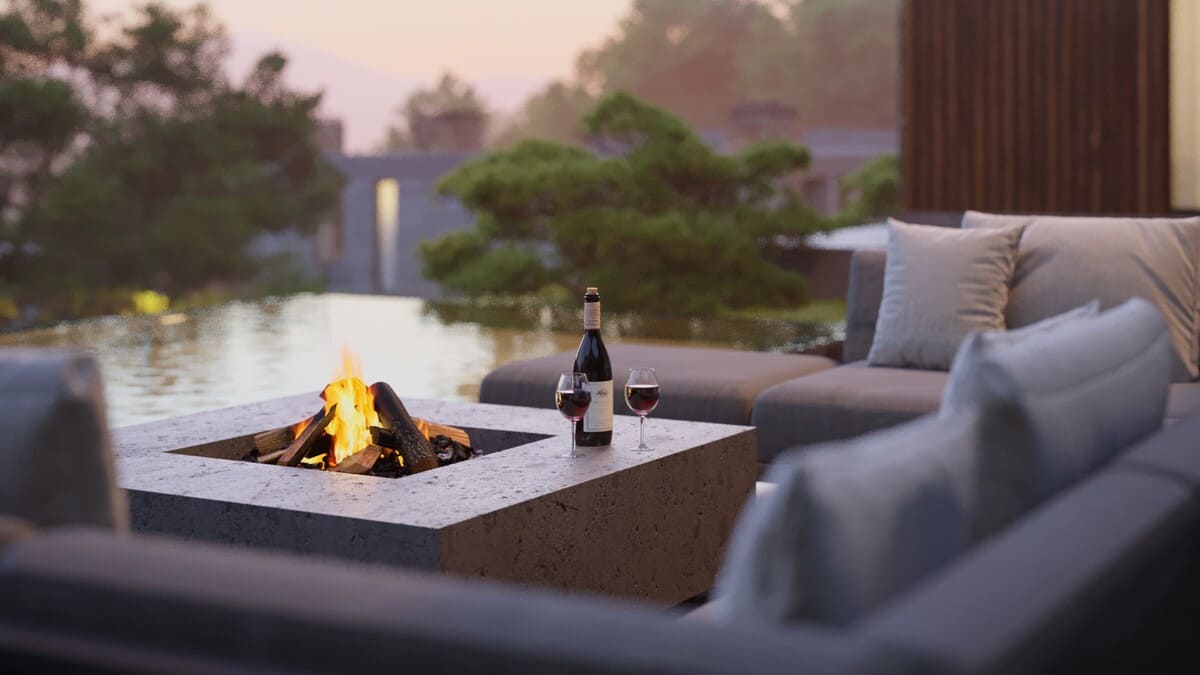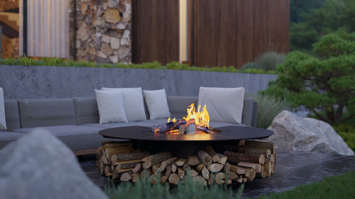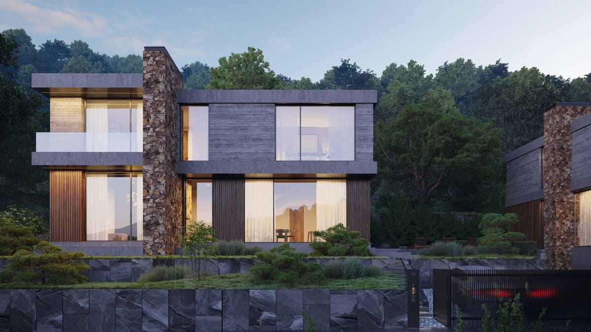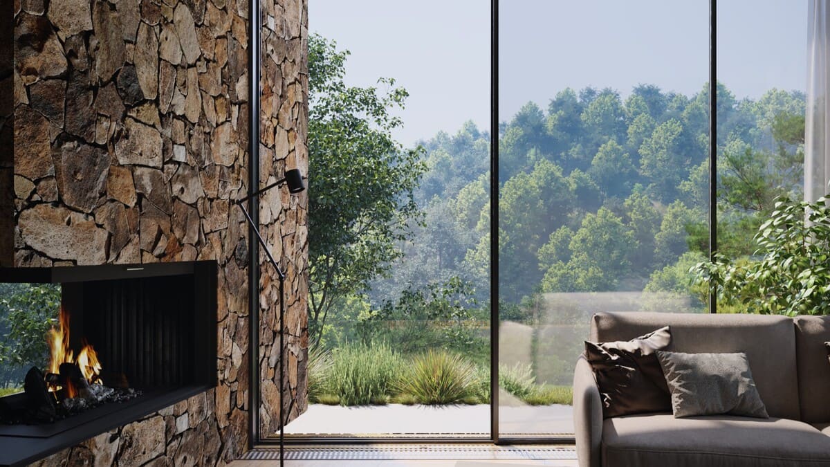 Панорамные окна и каминные порталы, выступающие за пределы фасада, стирают границы между интерьером и окружающей природой, создавая ощущение единого жилого пространства с лесом.