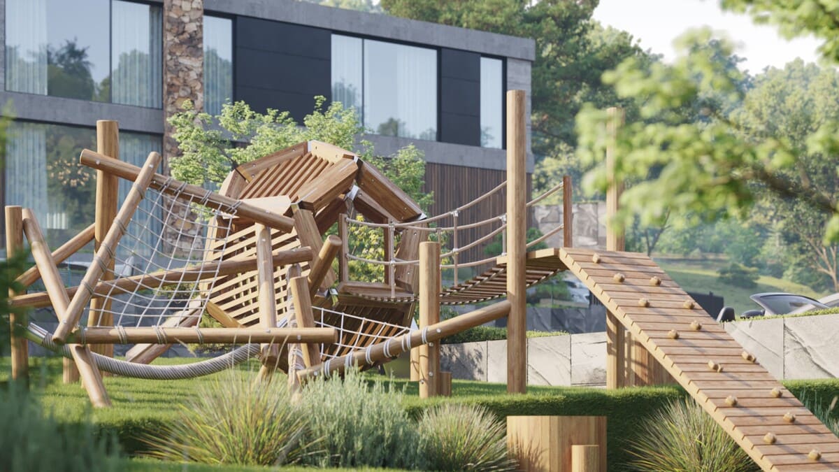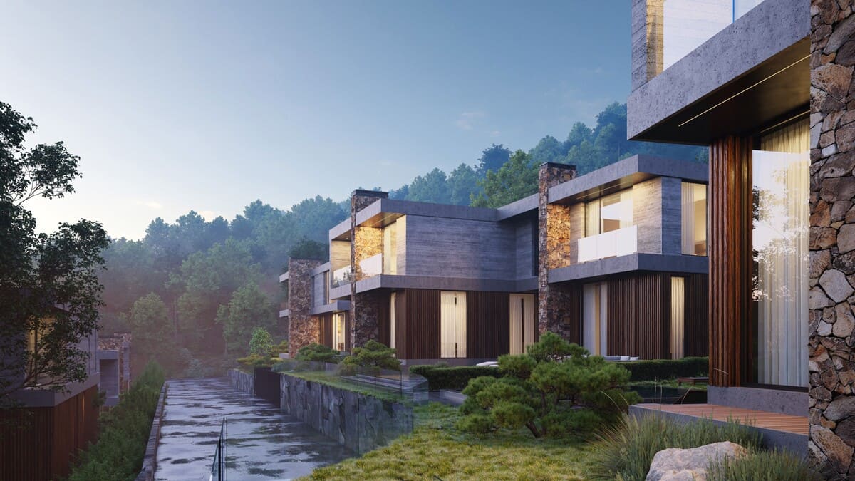 Каждый дом как будто естественным образом вписан в холмистый ландшафт – формы зданий повторяют изгибы склона, а фасады словно «выросли» среди деревьев.