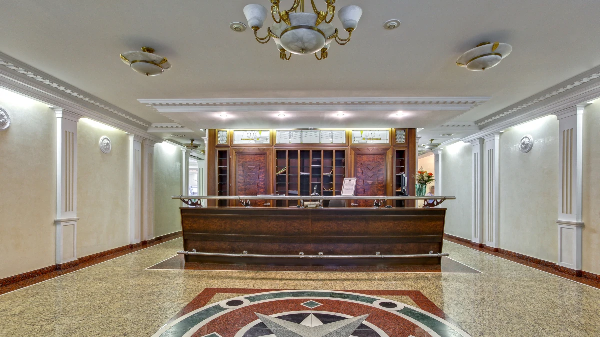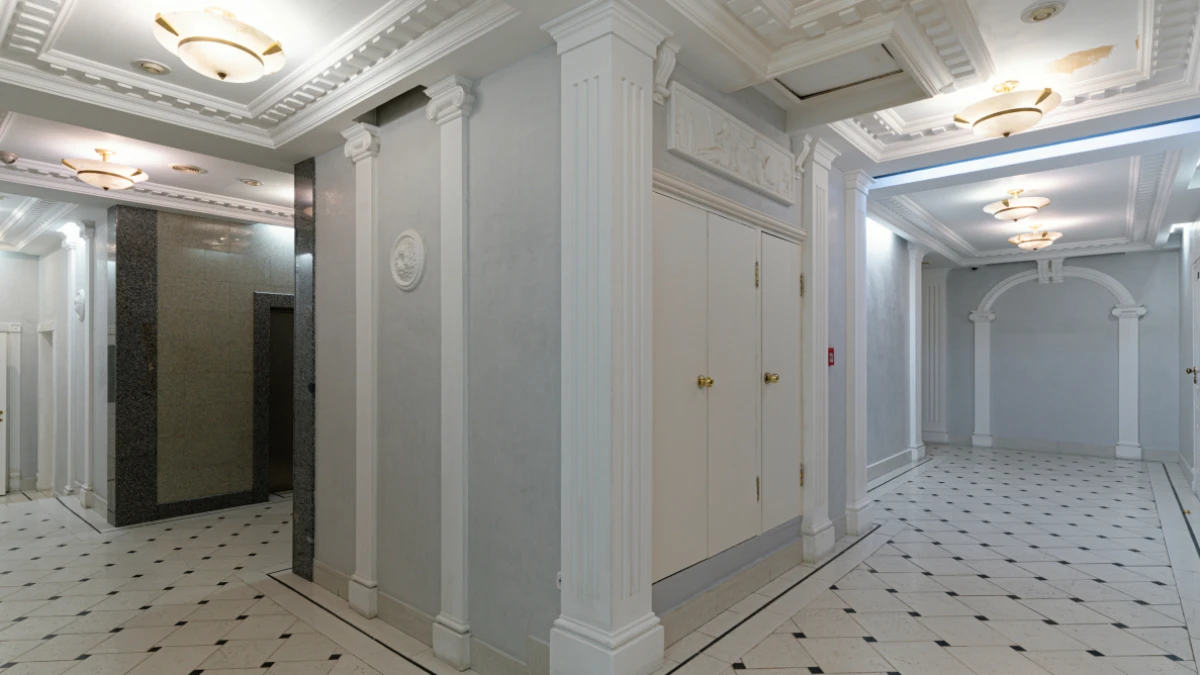 Лобби жилого комплекса украшают величественные колонны со стеклянным козырьком. Просторные холлы оформлены с использованием натурального камня, мозаики ручной работы и декоративных элементов, создающих атмосферу элегантности.