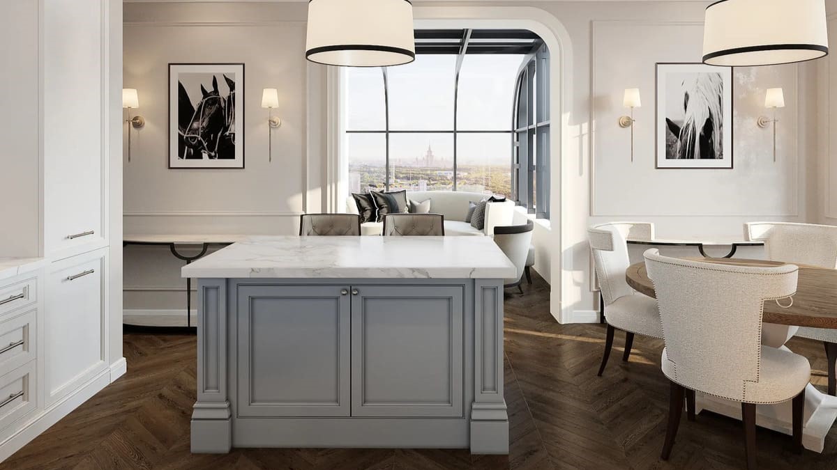 Мрамор и бархат, дерево и латунь, панорамные окна и зеркала создают впечатляющее пространство с высотой потолков и атмосферой современного салона.