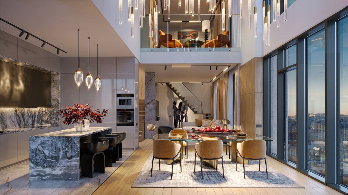 - пентхаусы с каминами, террасами, вторым светом и потолками высотой до 6,8 м;