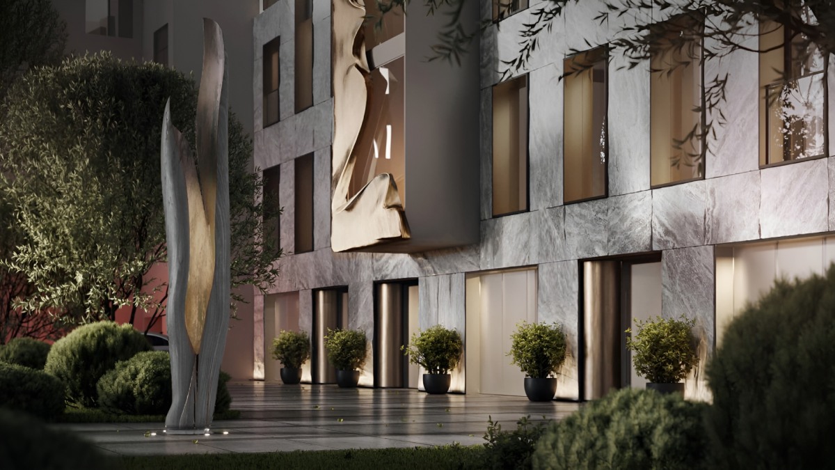 Фасад здания украшает скульптура Даши Намдакова – произведение, представленное в программе Венецианской биеннале 2022 года. Специально адаптированная под проект, она станет смысловым центром всей композиции.
