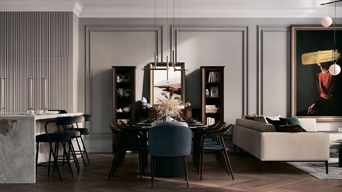 Природные материалы в отделке – металл, камень, дерево – усиливают ощущение монументальности и эстетики ручной работы.