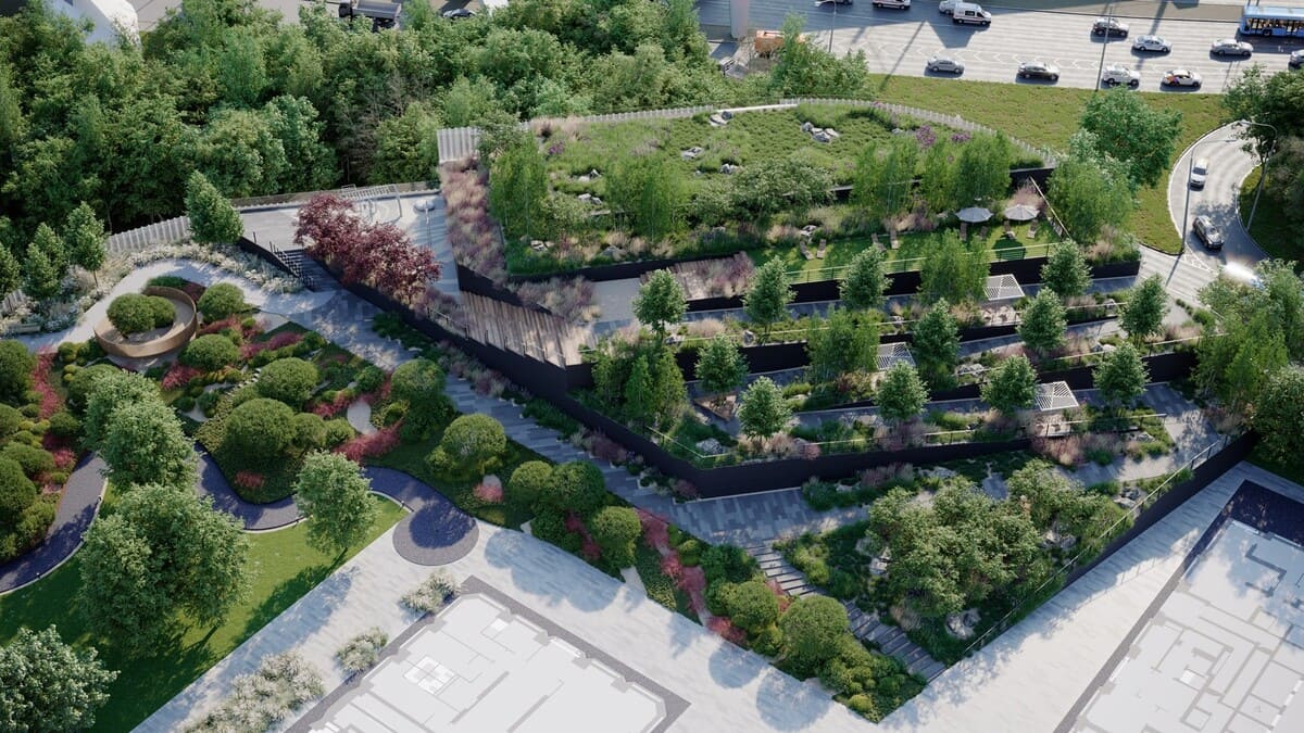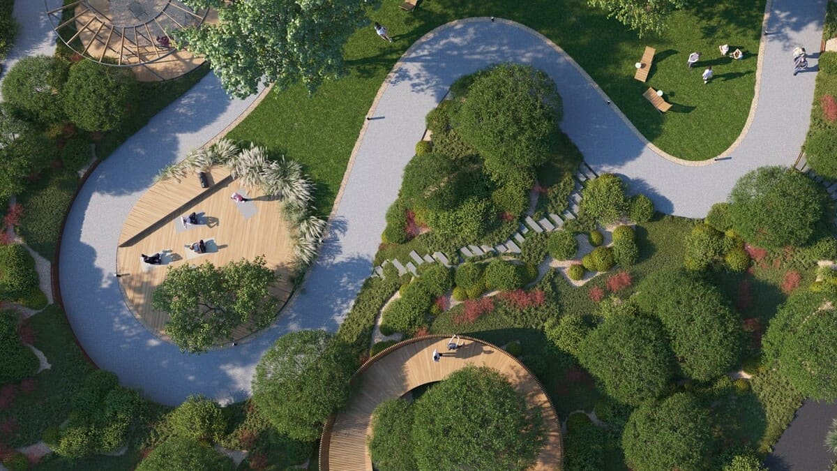 Половина территории комплекса отдана под озеленение. Здесь будет высажено более 18 000 декоративных растений и более 100 деревьев.