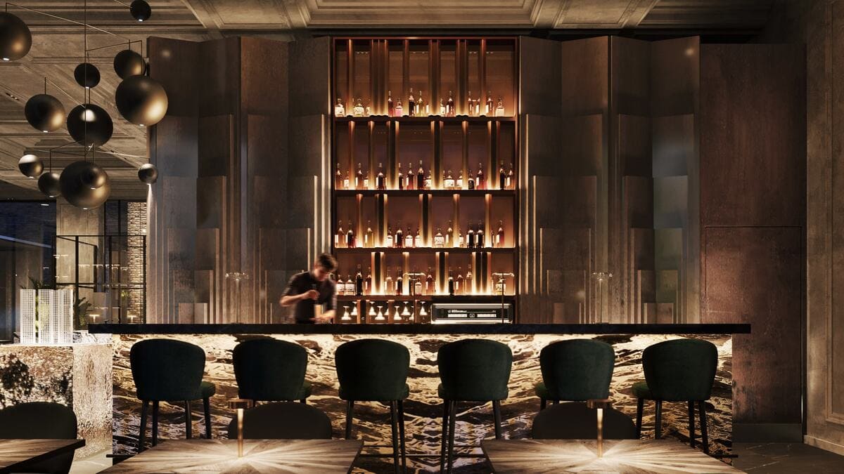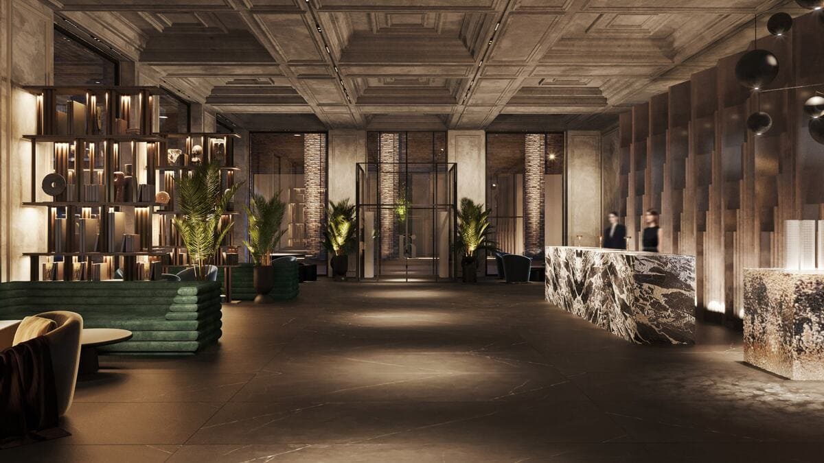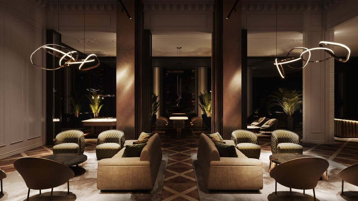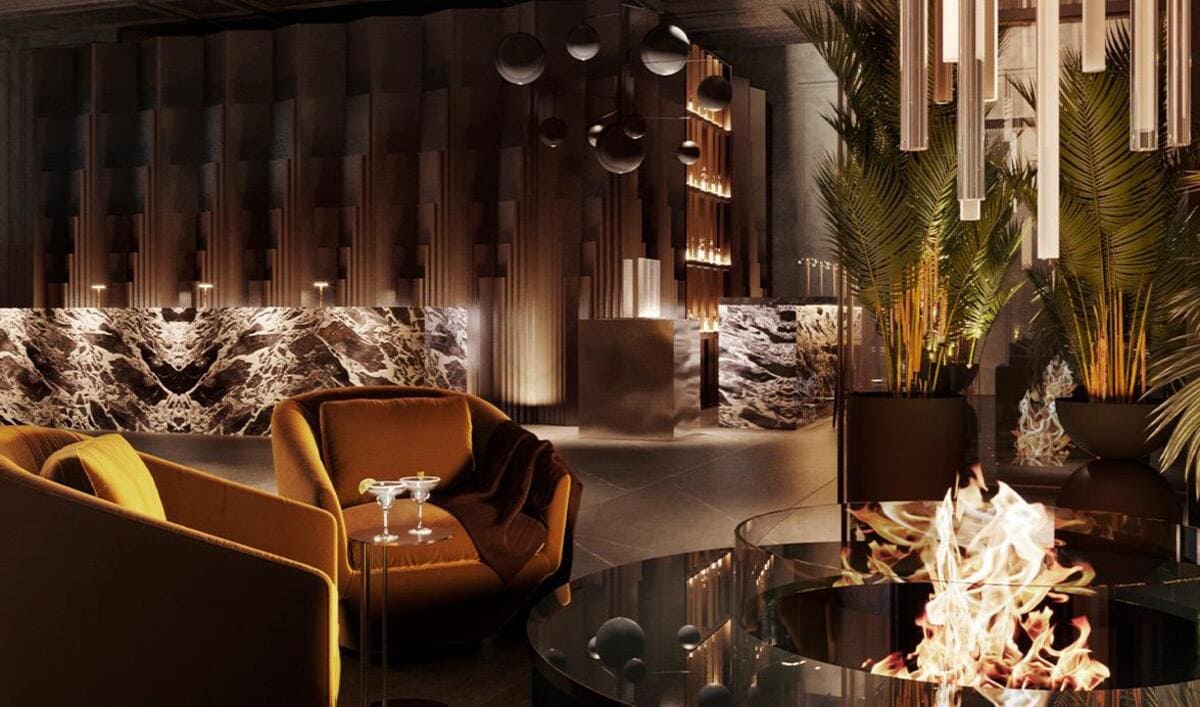 Интерьеры общественных зон оформлены студией Sundukovy Sisters – с геометричной стойкой ресепшн ручной работы, отделкой панелями с металлическими бликами и декором с живым светом. Пространство включает кафе-зону, каминный уголок, lounge с мягкой мебелью и биокамином.