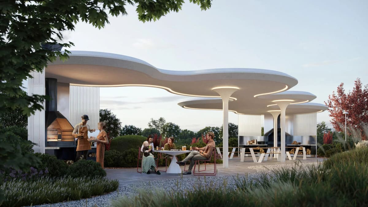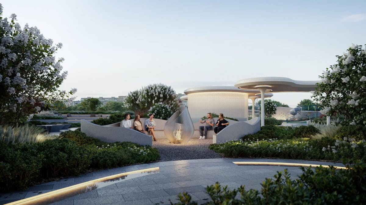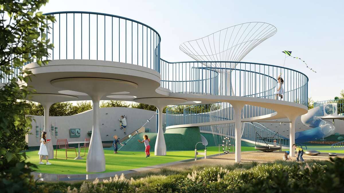 Для активного досуга предусмотрены спортивные кластеры с тренажёрами, площадки для йоги, теннисные столы и двухуровневая детская площадка с зонами для малышей и подростков.