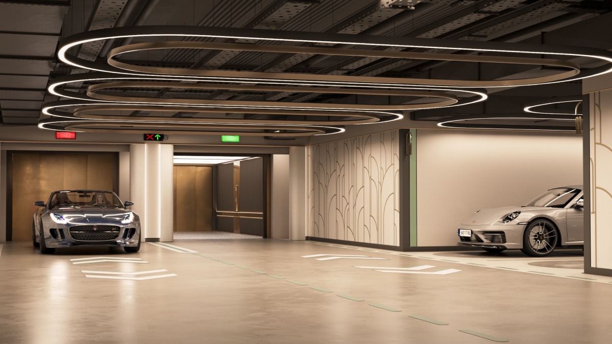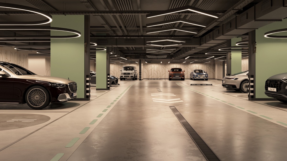 Просторный подземный паркинг с двумя машинными лифтами и пассажирским лифтом, соединённым напрямую с жилыми этажами.