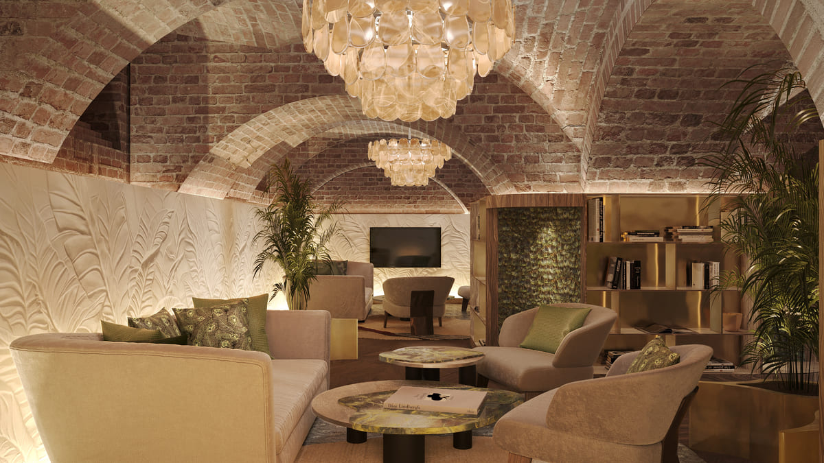 Пространство Clubhouse с lounge-зоной, местом для общения и занятий велнесом.