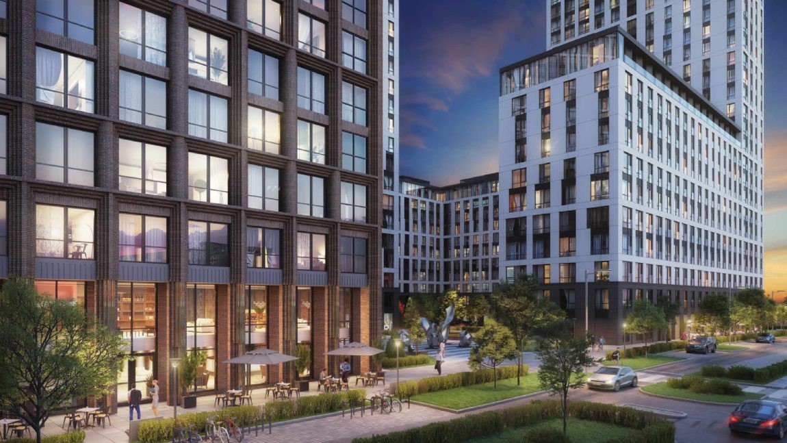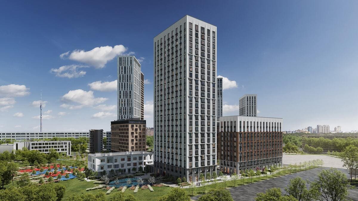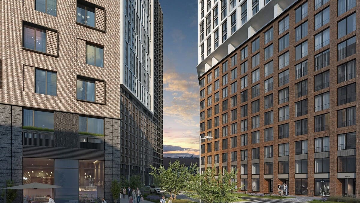 Проект включает пять жилых корпусов переменной этажности, объединённых приватным благоустроенным пространством с зелёными дворами, детскими игровыми зонами и местами для отдыха всей семьёй.