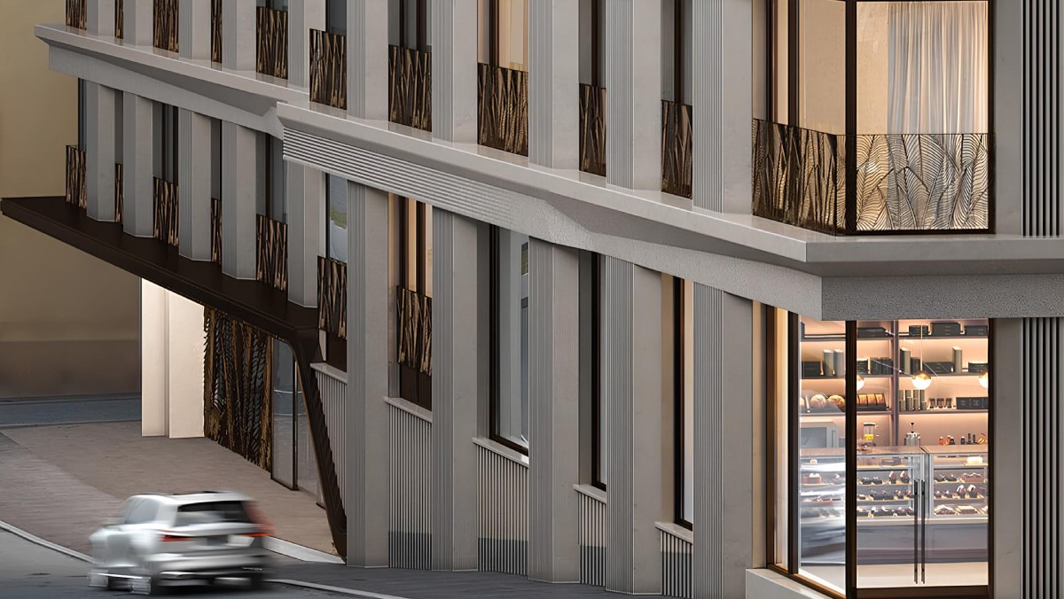 Фасад здания выполнен из натурального камня, что придаёт ему монументальность и долговечность, а лаконичные линии формируют ясный и современный облик.