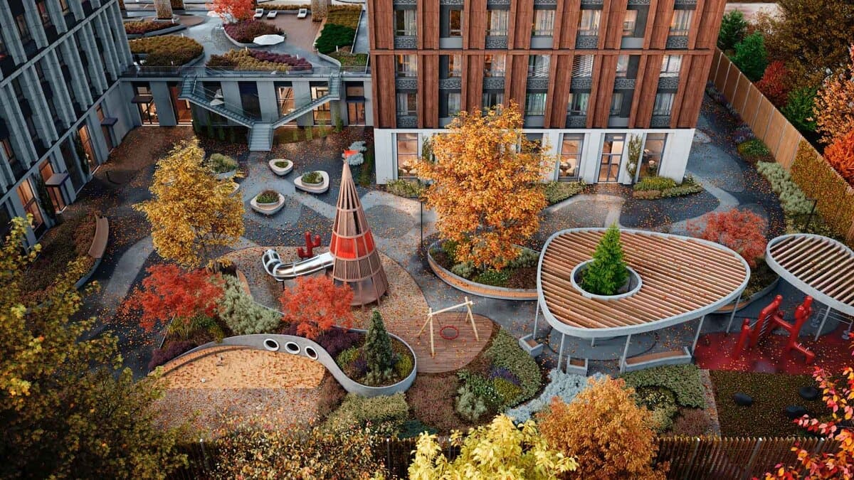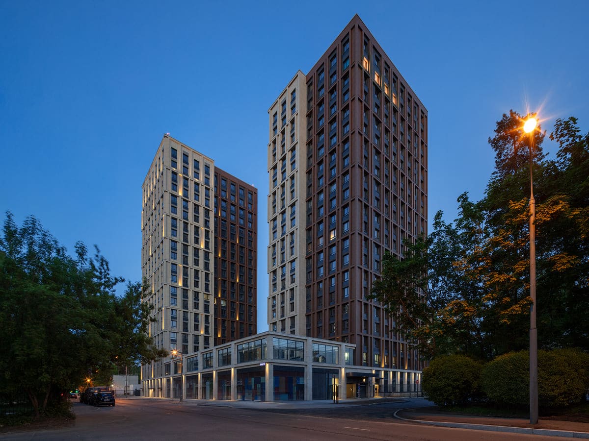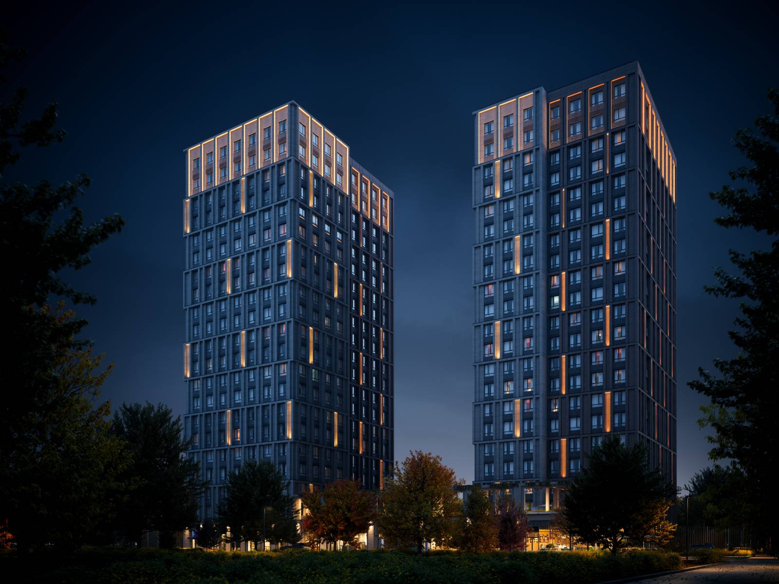 Проект включает всего 2 корпуса высотой 21 этаж, формируя камерную и спокойную среду с благоустроенной территорией и ощущением приватности.
