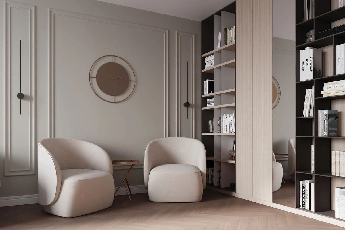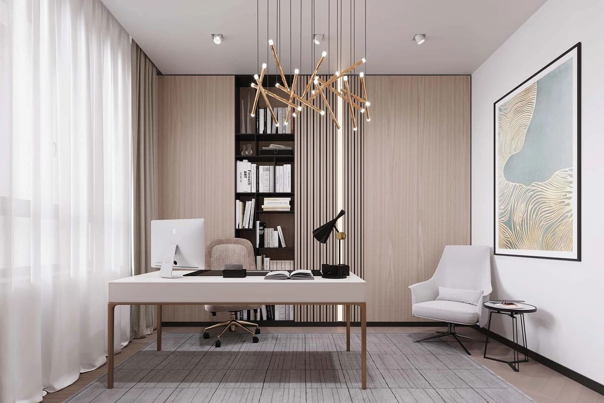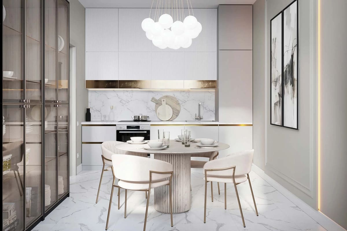 Светлые тона, строгие линии, отделка из натурального камня, акценты «под латунь», окна в пол – создают атмосферу спокойного достоинства.
