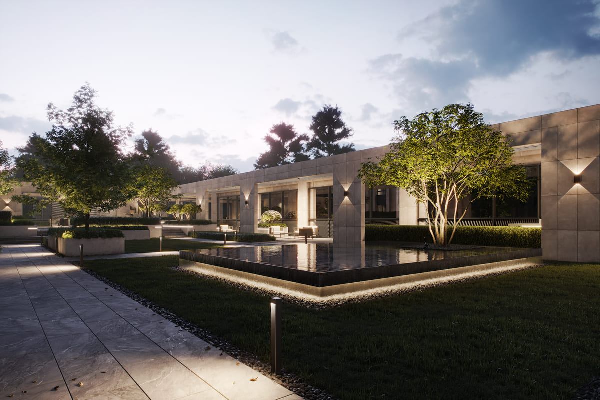 Сад воспринимается как естественное продолжение парков, окружающих комплекс – здесь легко раствориться в тишине, не покидая дома.
