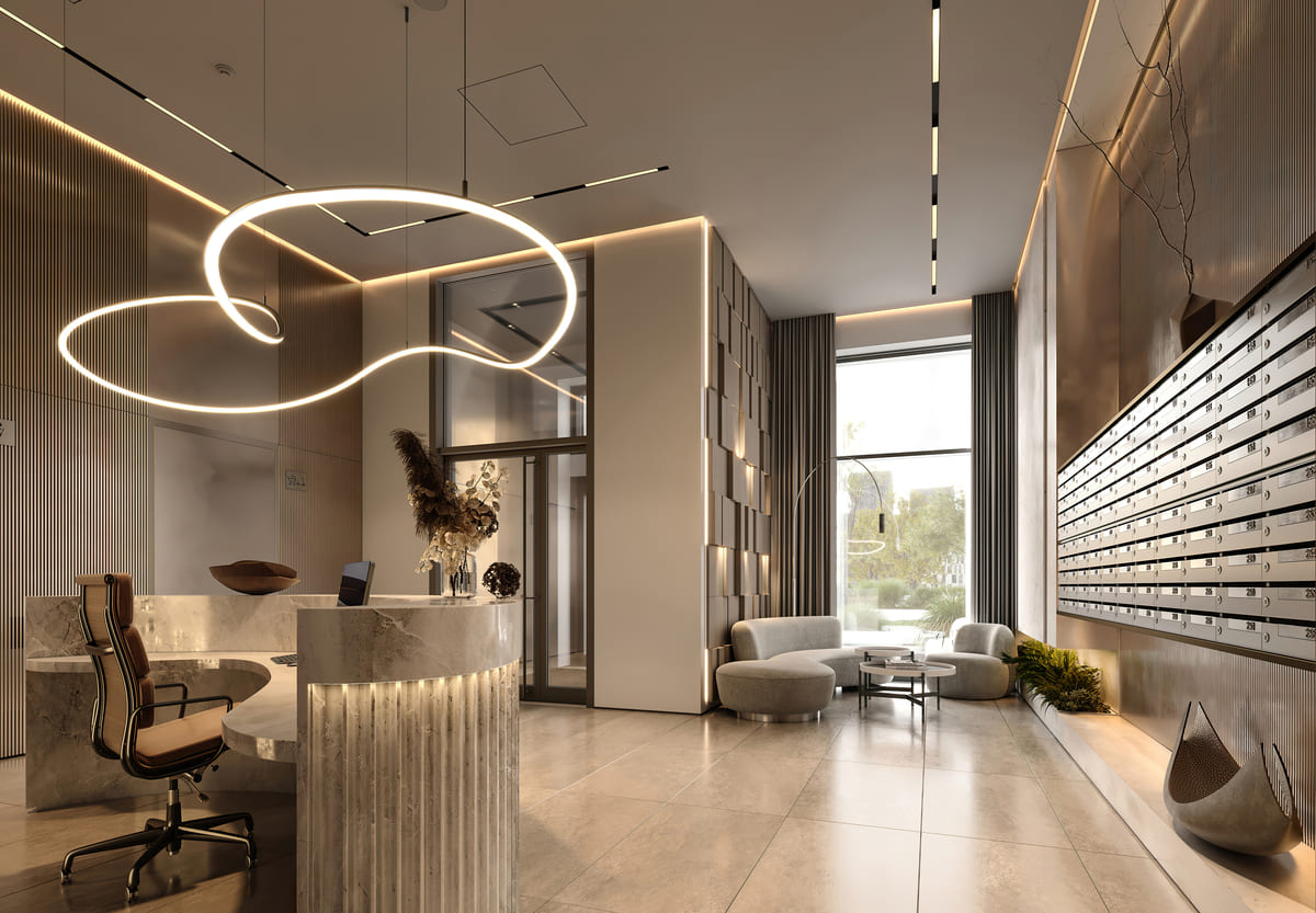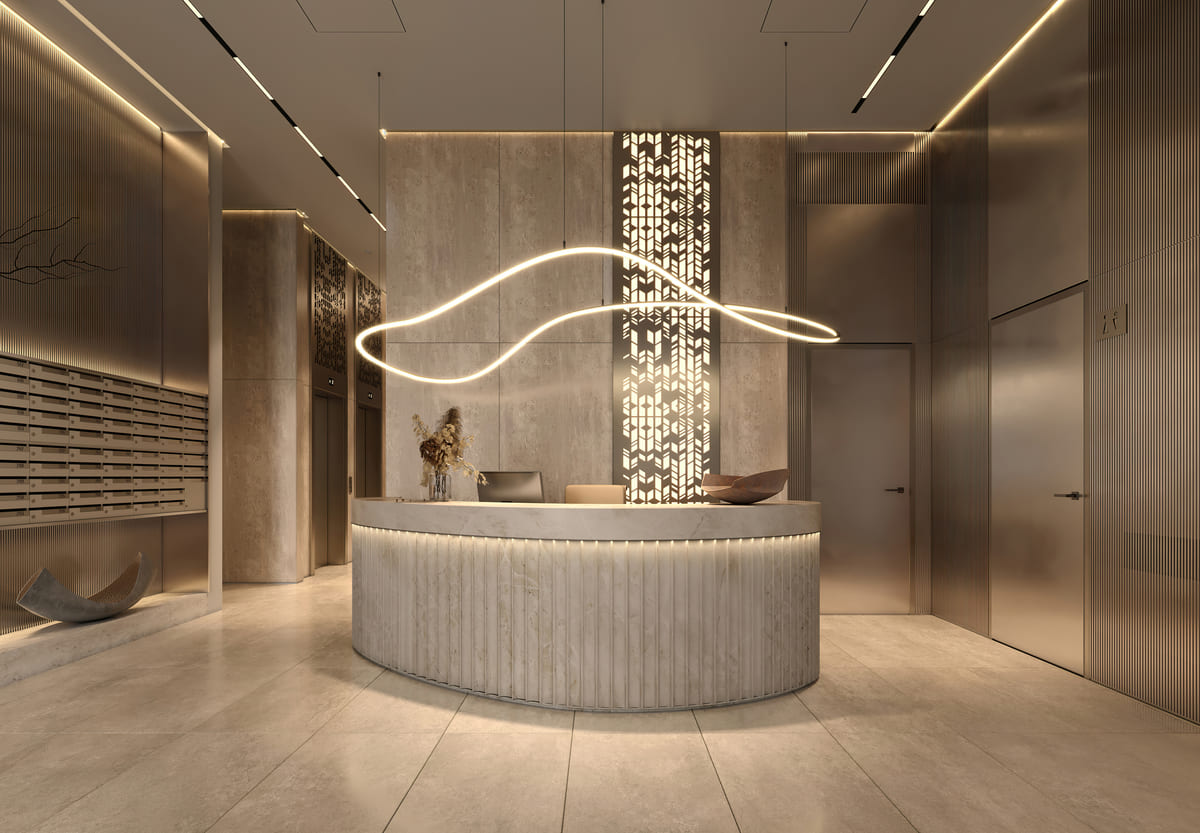 Пространства входных групп спроектированы бюро DBA-Group в стиле современной классики.