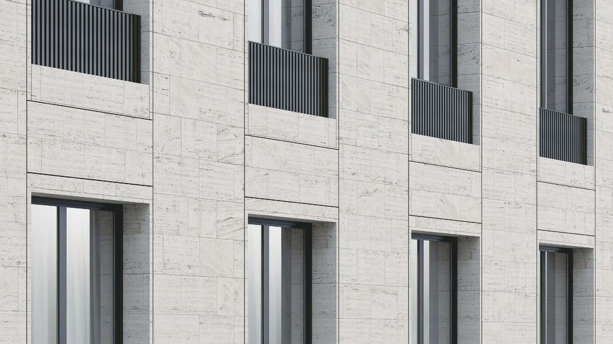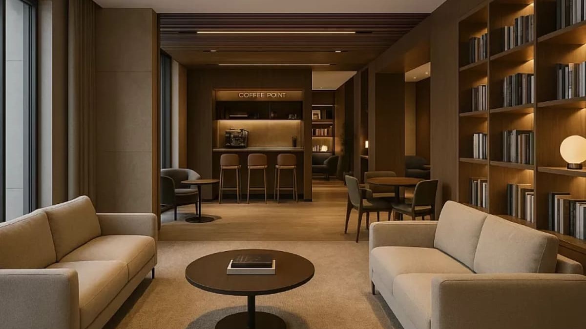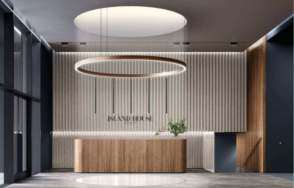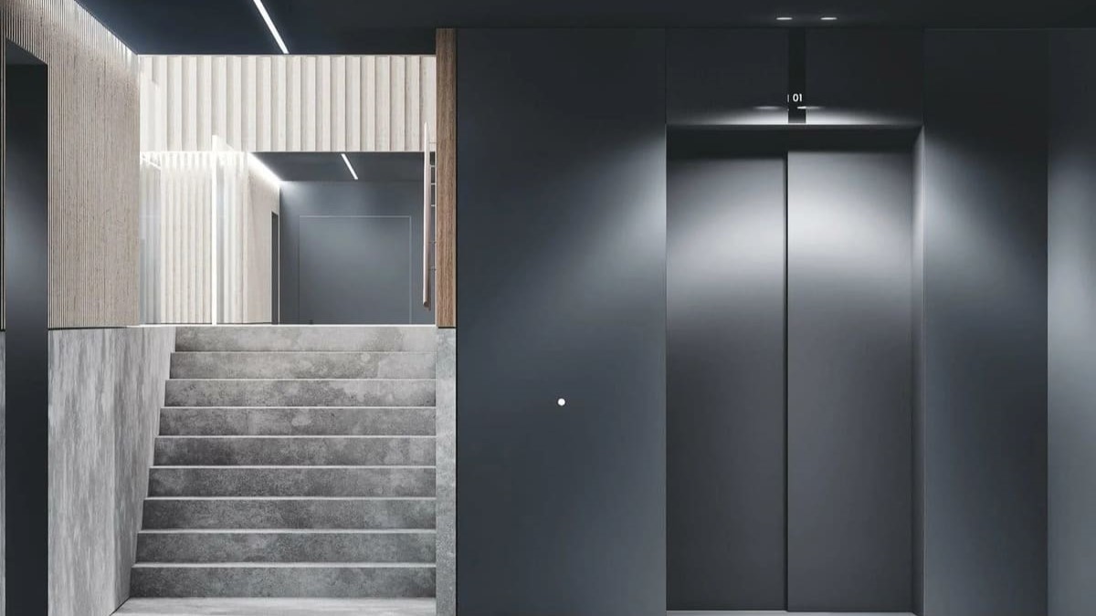 В лобби используются натуральный камень, тёплый шпон, графитовые металлы и полированный бетон, создающие атмосферу премиального уюта. Двери в апартаменты подчеркнуты световыми контурами.