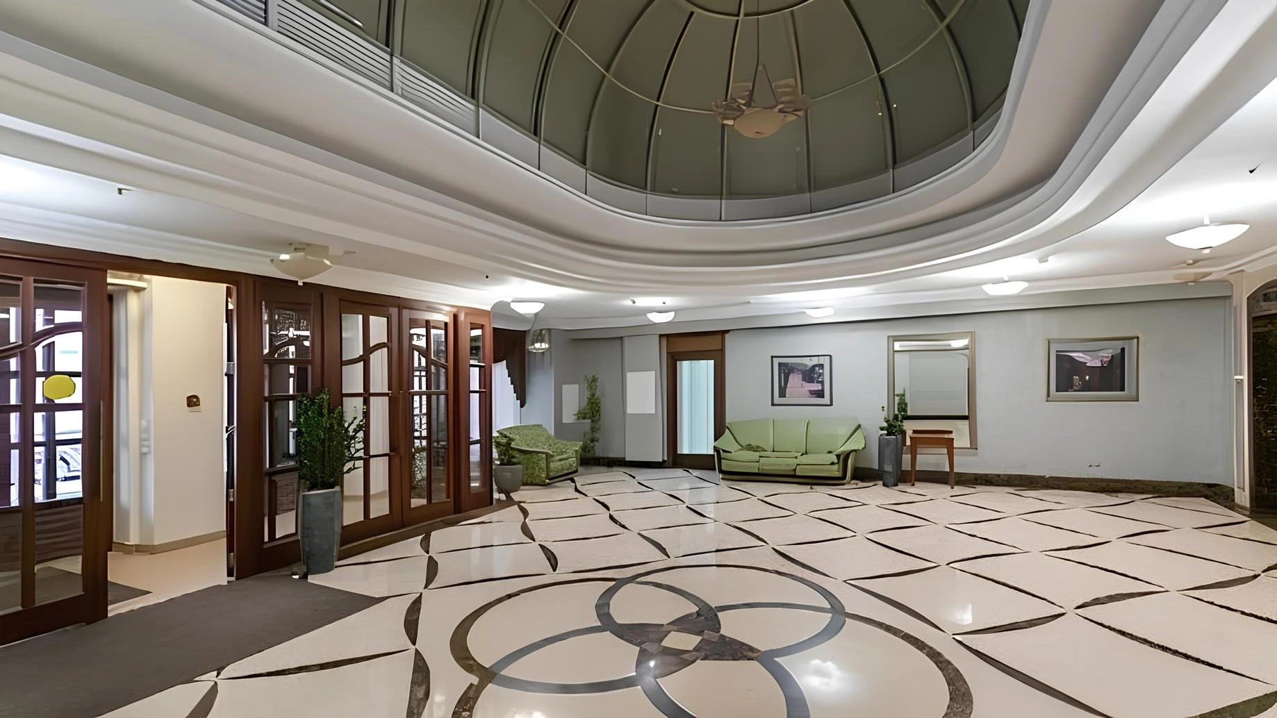 Входная группа встречает гостей просторным лобби с высокими потолками. Интерьер выполнен в спокойных классических тонах с элементами современного дизайна.