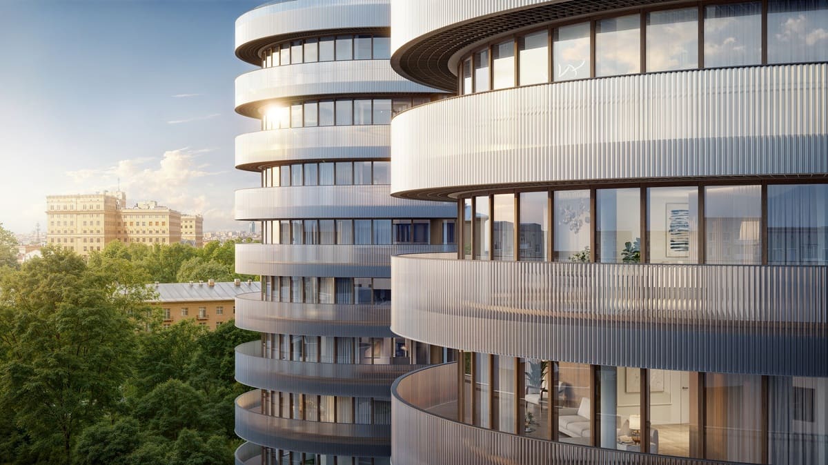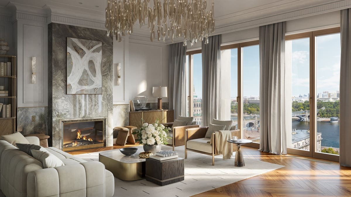 Среднеэтажная зона представлена тремя современными 10-этажными корпусами (по 23-30 квартир в каждом) и архитектурной жемчужиной комплекса – величественным неоклассическим особняком с панорамными видами на Кремль, Нескучный сад и Москву-реку.