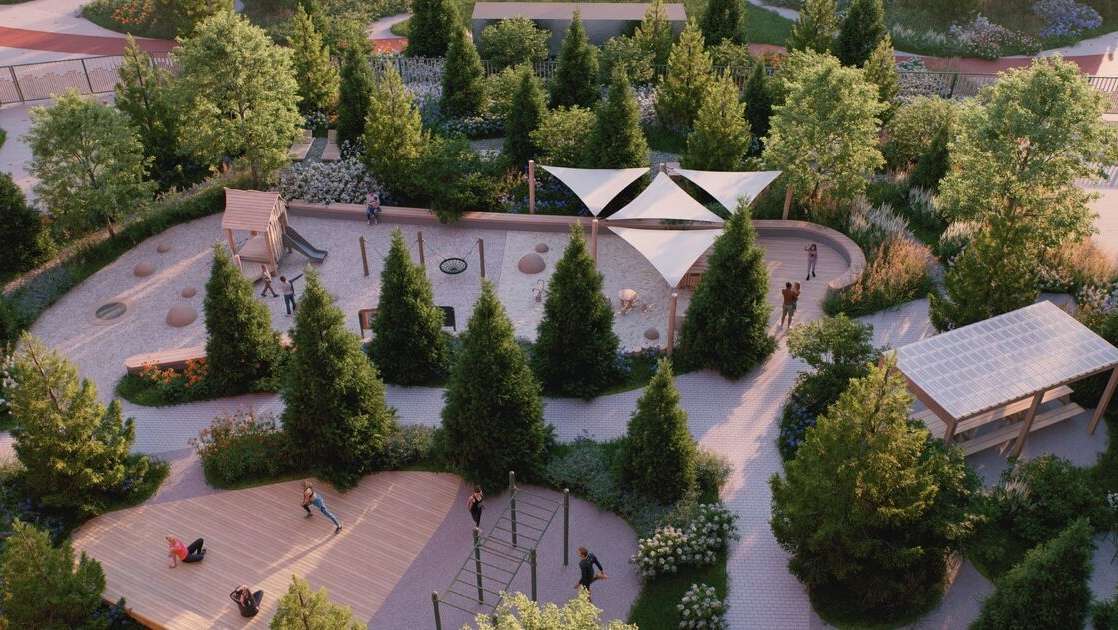 Внутреннее пространство квартала представляет собой огромный парк площадью 3 гектара с хвойными деревьями и центральным прудом с каскадами. Здесь проложены километры прогулочных и веломаршрутов, проходящих через березовые рощи и луговые зоны.