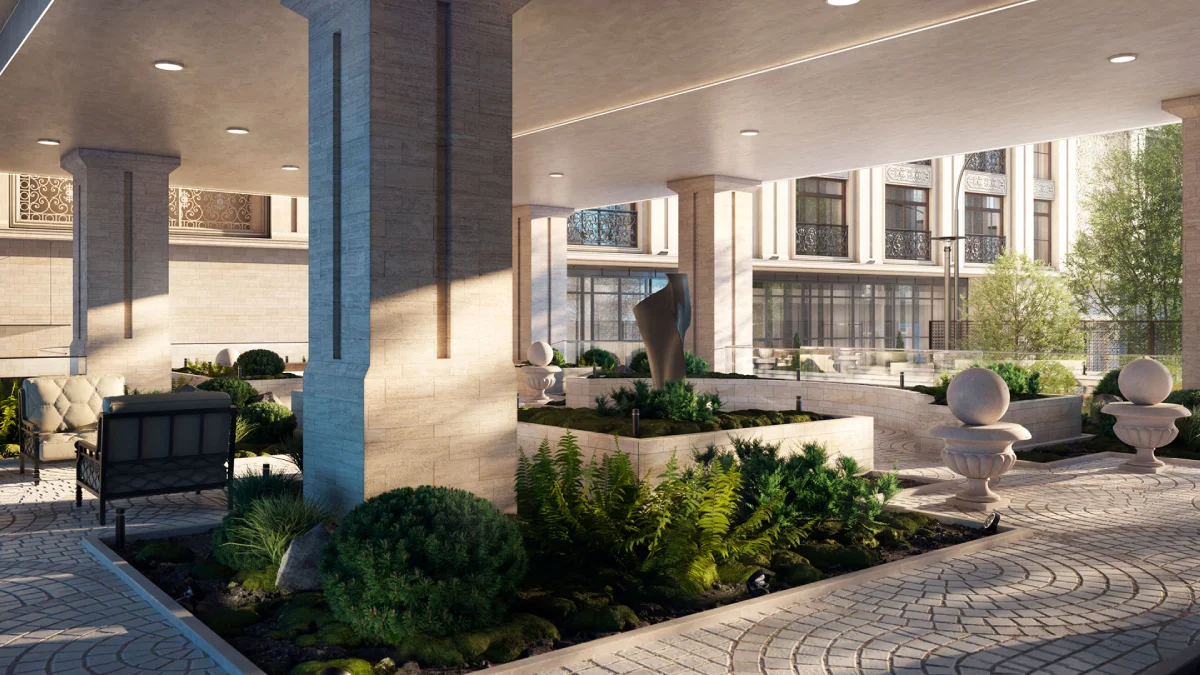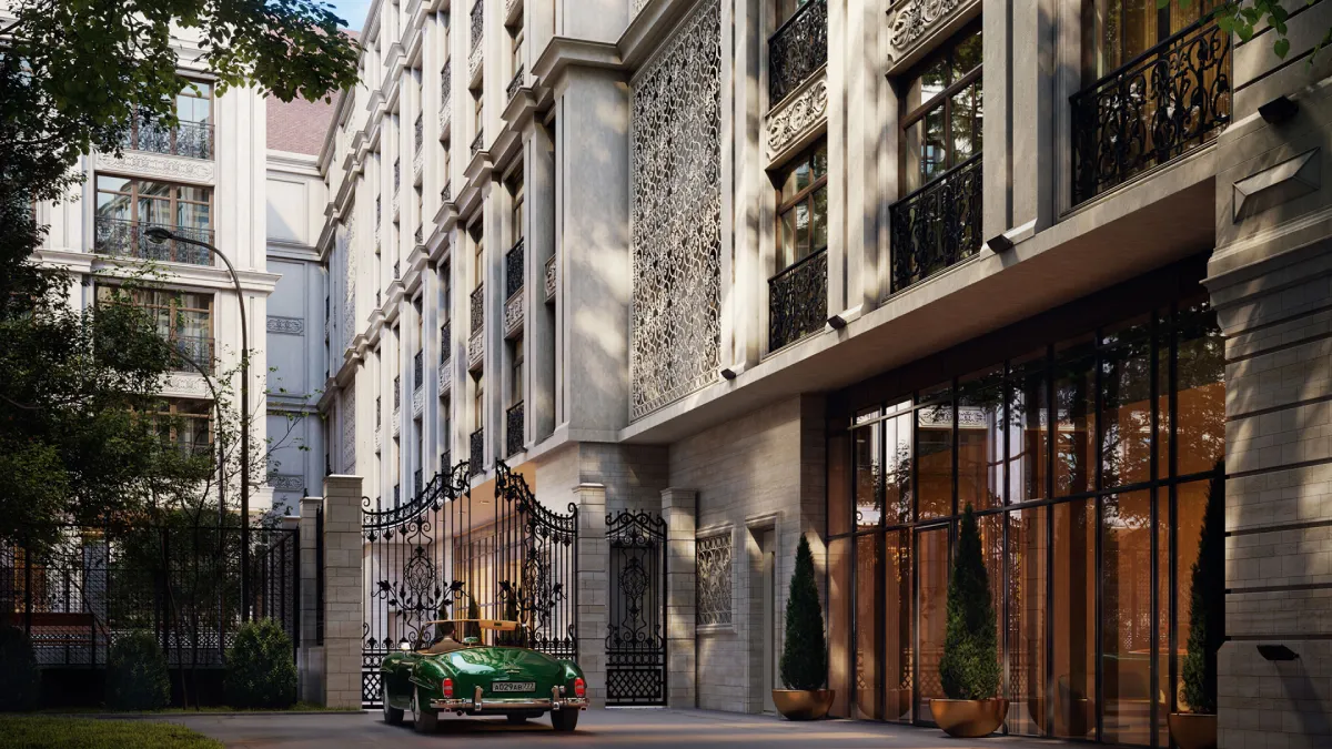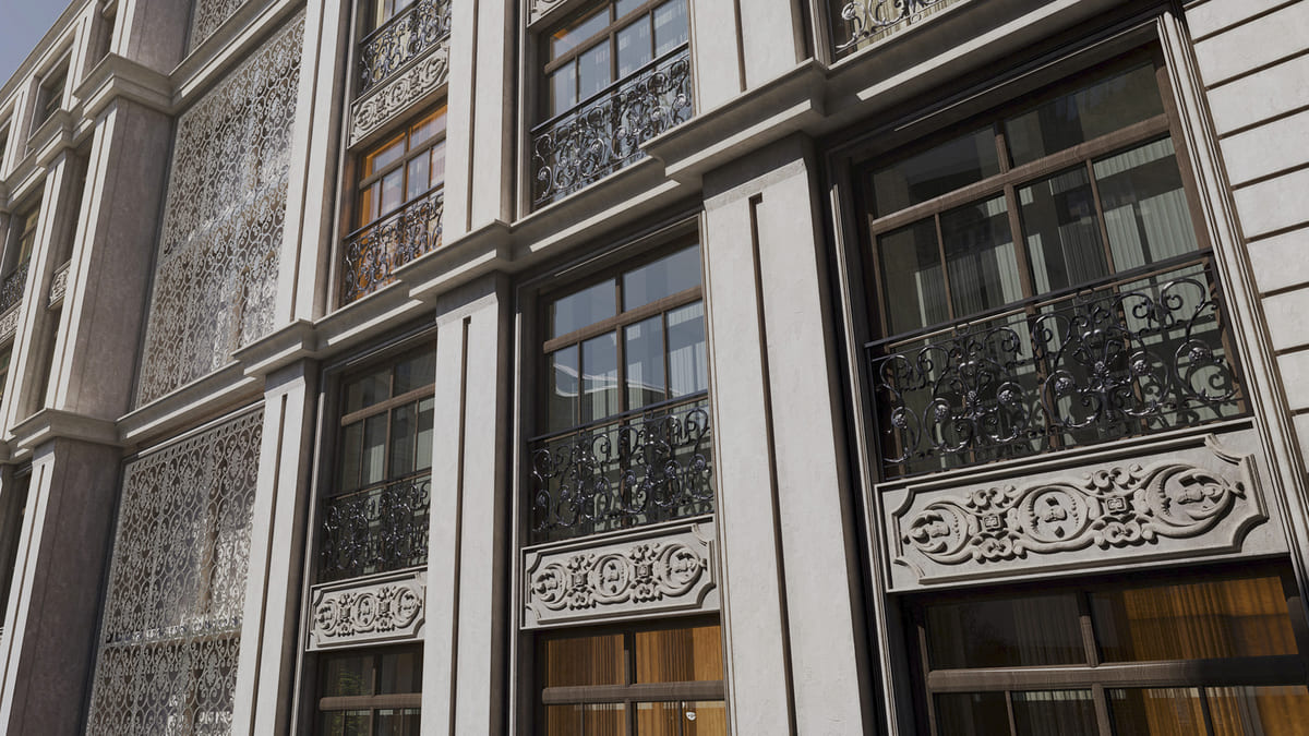Классические формы с ажурными коваными решетками балконов, стройными пилястрами и резьбой по натуральному камню создают элегантный, аристократичный силуэт, неподвластный времени.