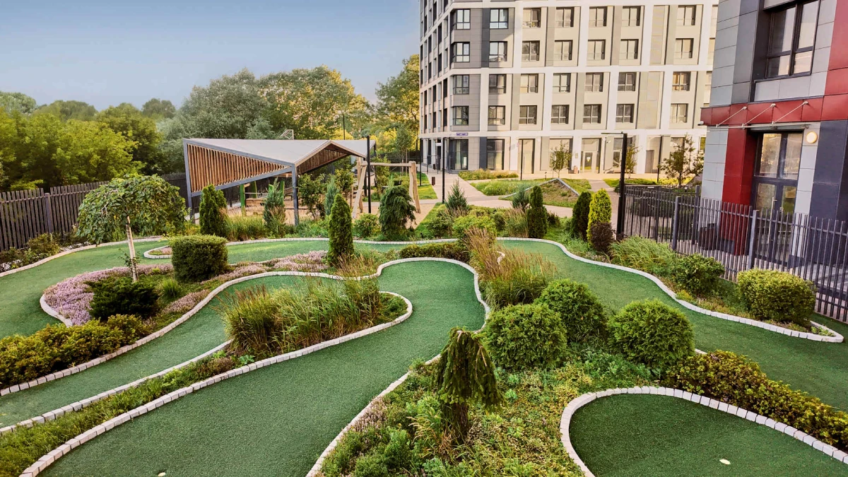 Внутренние благоустроенные дворы «Кутузов Град» продуманы как многофункциональное пространство для всех возрастов. Здесь есть современные детские площадки, игровые зоны для подростков, уютные места для отдыха и комьюнити, воркаут-площадка и поле для мини-гольфа. Территория квартала благоустроена, озеленена, оснащена системой навигации и архитектурным освещением, создающим атмосферу уюта в любое время суток.