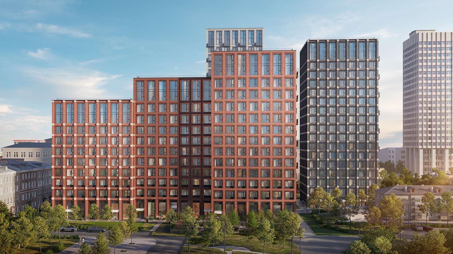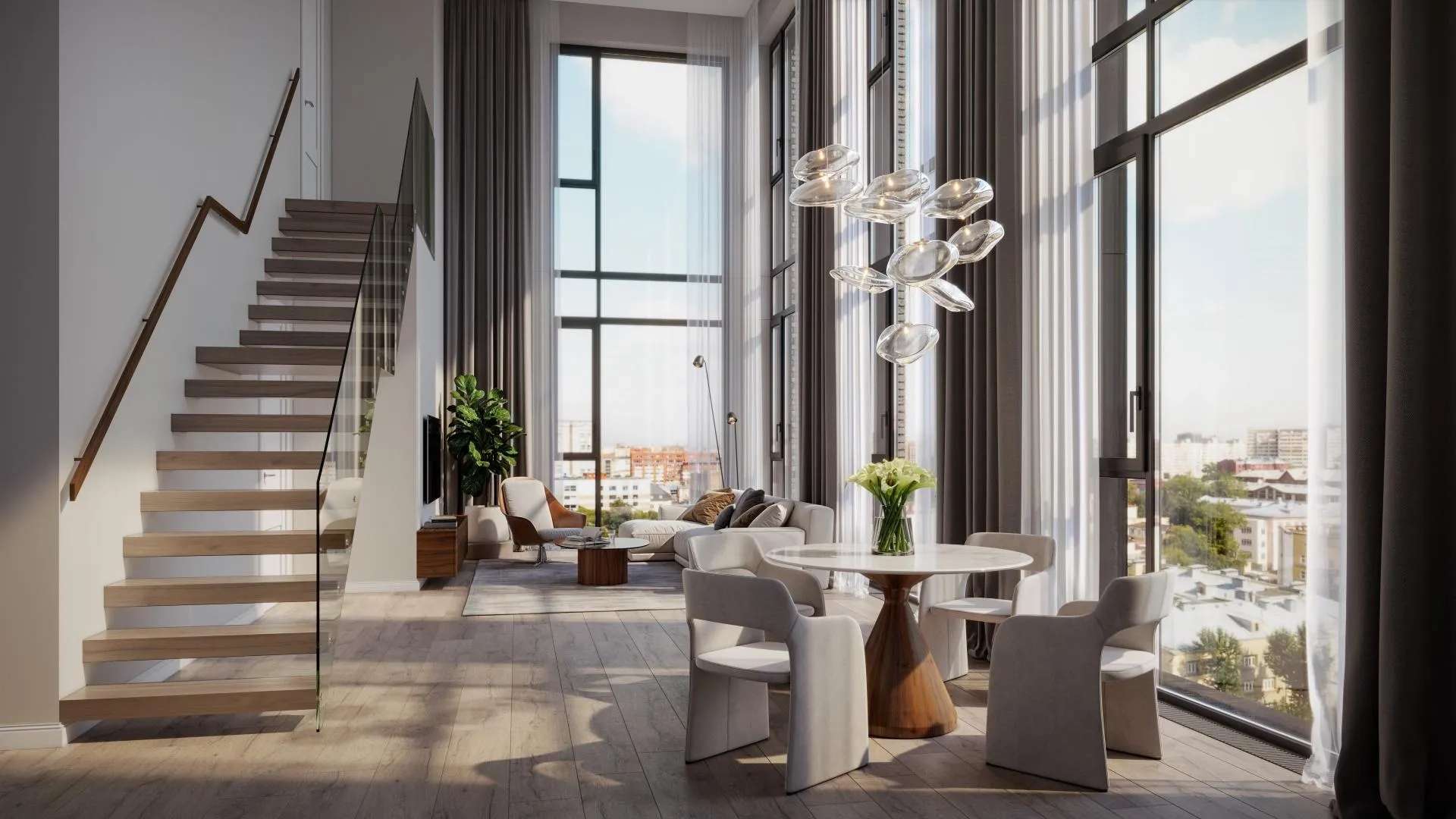 Архитектурный облик формируют выразительные высотные секции с мягкими закруглёнными углами. Благодаря панорамному остеклению и ориентации окон на две-три стороны света, эти объёмы наполняют интерьеры светом и воздухом, открывая город с разных ракурсов. На верхних этажах есть квартиры с возможностью установки камина, а многие лоты имеют балконы или террасы.
