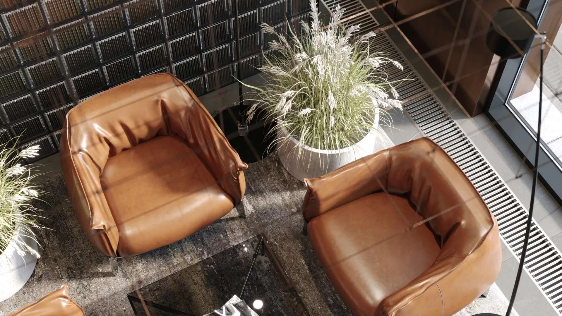Лобби жилого комплекса спроектированы как логичное продолжение архитектуры фасадов и выполнены в геометричном, монохромном стиле с использованием натуральных материалов.